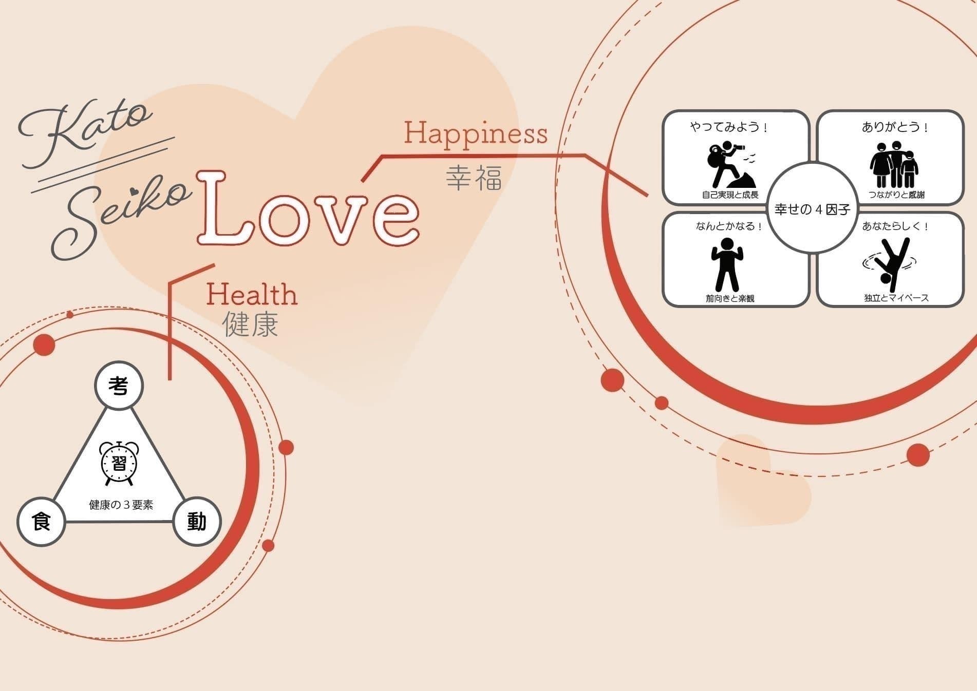 この「健康の三要素」と「幸福に生きるための4因子」の両方を具体化し、行動していくことで、あなたの人生そのものが「LOVE」に近づき、あなたの存在自体が「LOVE」になっていくでしょう。