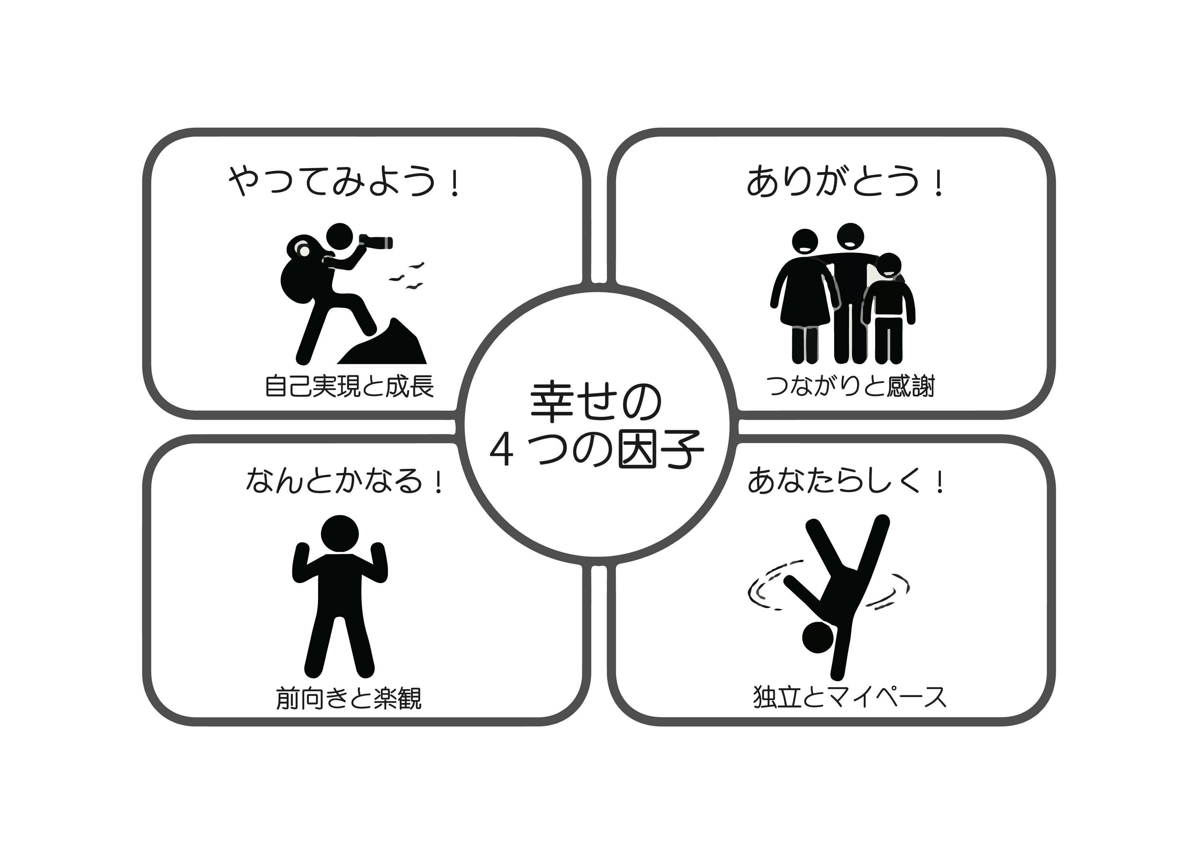 幸せの4つの因子とは、慶應義塾大学教授の前野隆司氏の研究グループがコンピュータ解析により導き出した「自己実現と成長・つながりと感謝・まえむきと楽観・独立とマイペース」のことを指す。この4つの因子を少しでも高めていくことが幸せにつながるという。