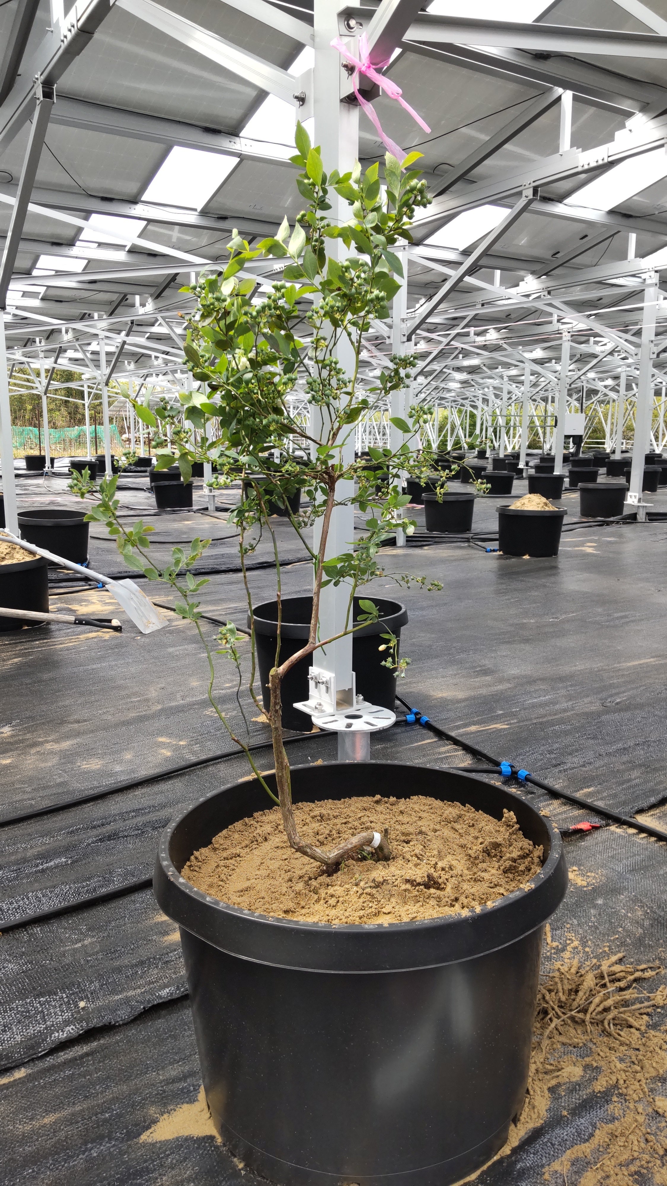 本プロジェクトは、ソーラーパネルのもと、ポット養液栽培のブルーベリーを育て、