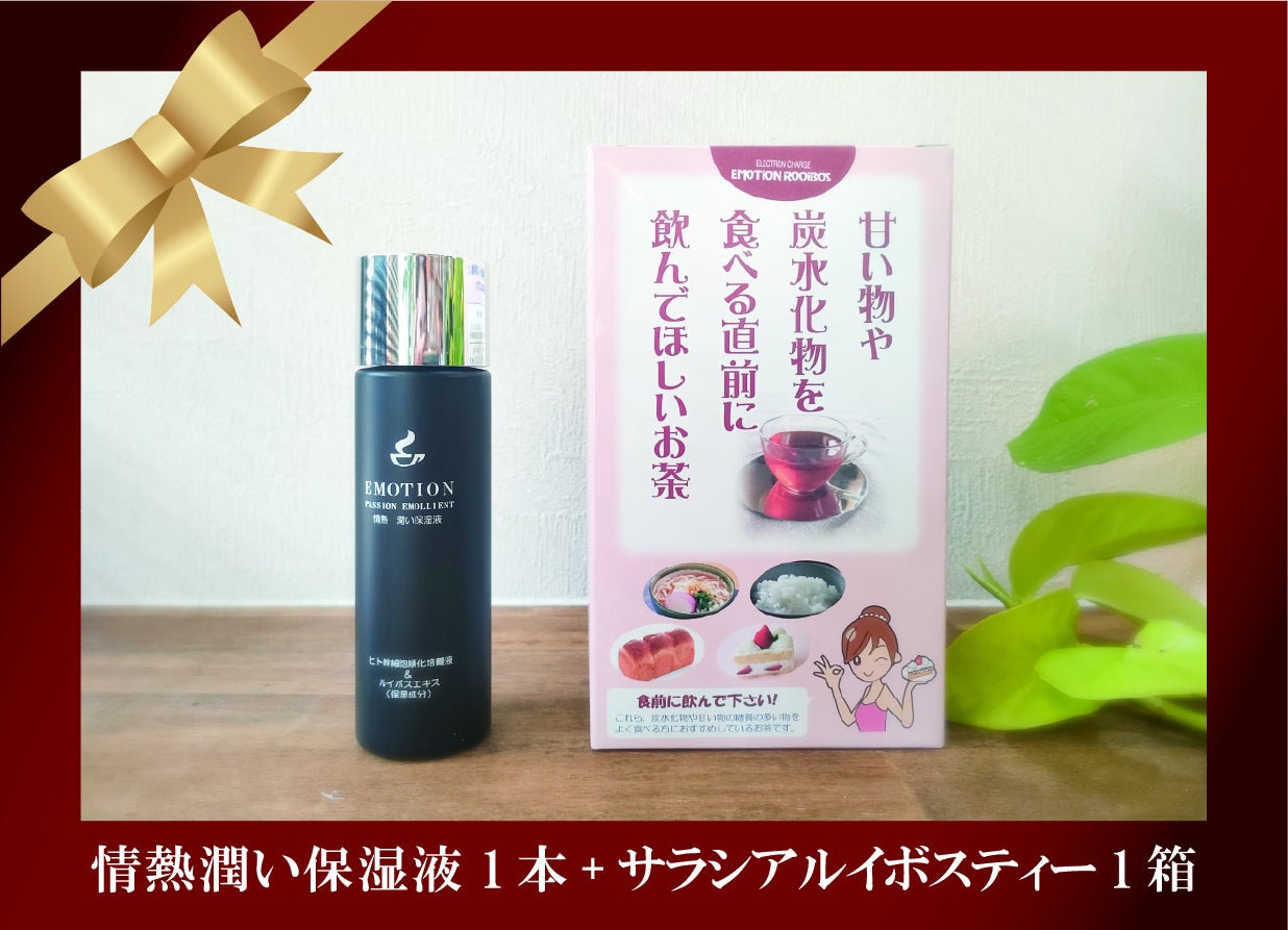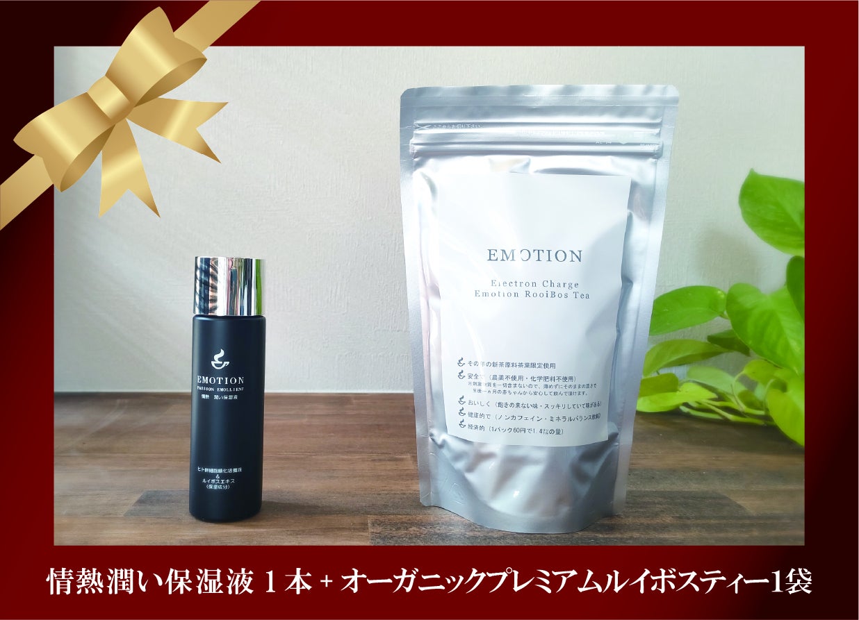 「エモーション情熱潤い保湿液」100ml(11,000円、税込、送料込)1本+エモーションのメイン商品である2種類の商品をどちらか一品を提供させて頂きます。※支援額¥11,000の場合