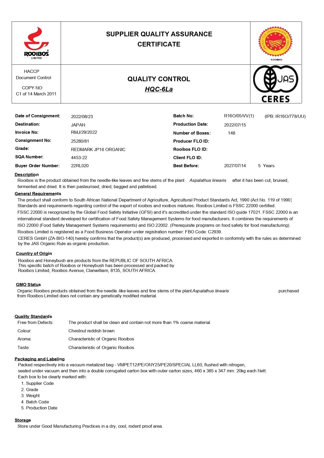 おそらく、どこのルイボスティーより、質と味(その年の新茶原料限定:賞味期限2027年7月14日)が優れていると思います。