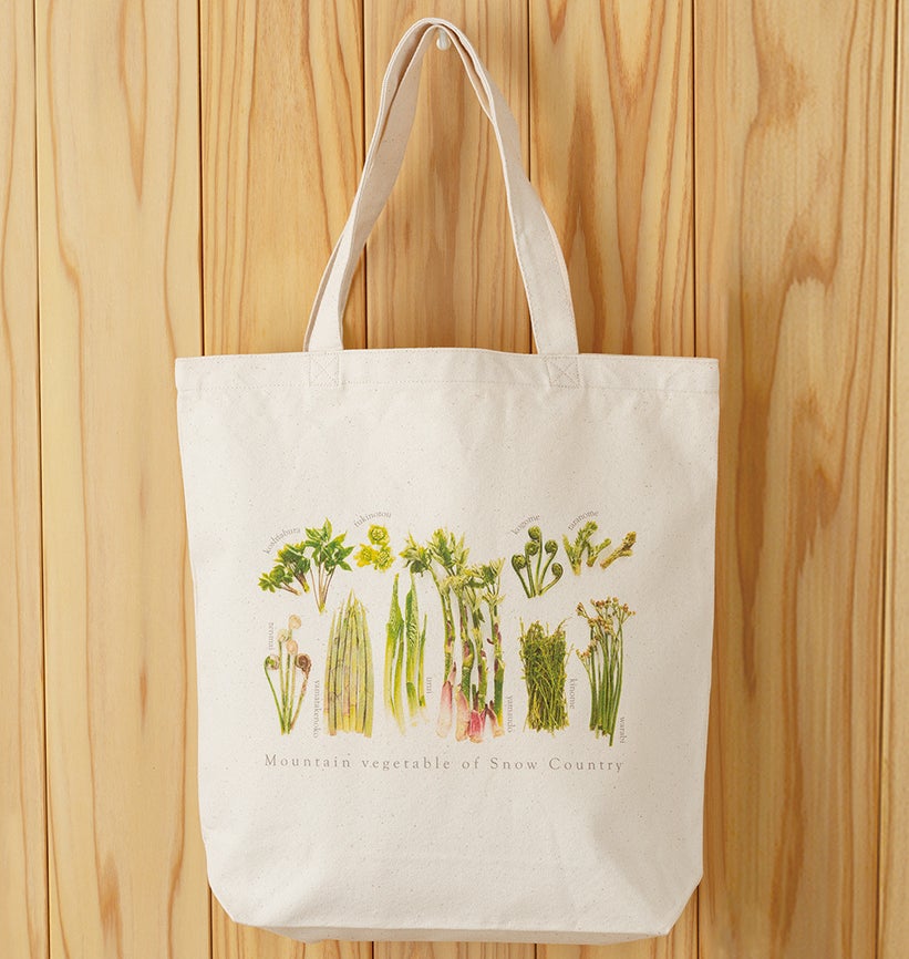 🎁 雪国 新潟の春の喜び「山菜」をプリントした「着る山菜シリーズ」のトートバッグ