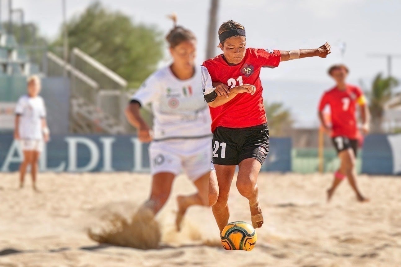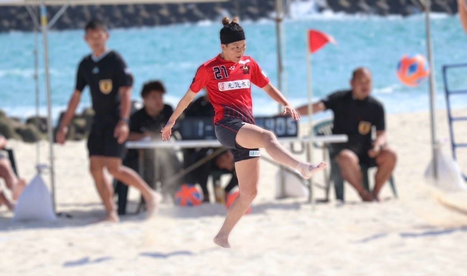 砂の上でアクロバティックなプレーが次々と繰り広げられるビーチサッカー。