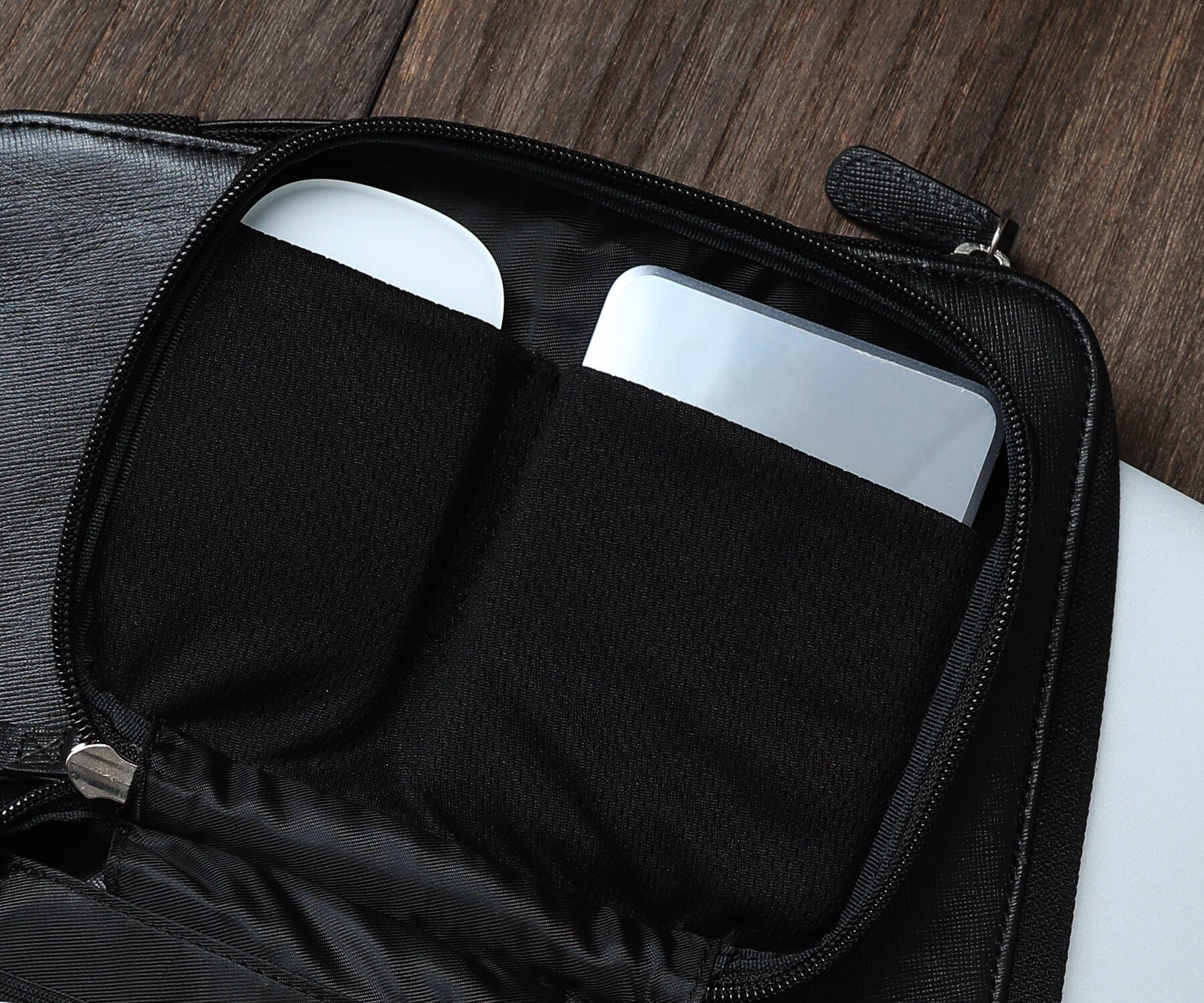 Digital Caseにはメイン収納と別に、タブレット端末や雑誌などの収納に便利なサブポケットを設置しております。仕切りには高密度フランネル素材を使用しており、メインエリアと接触する事なく保護することが可能です。