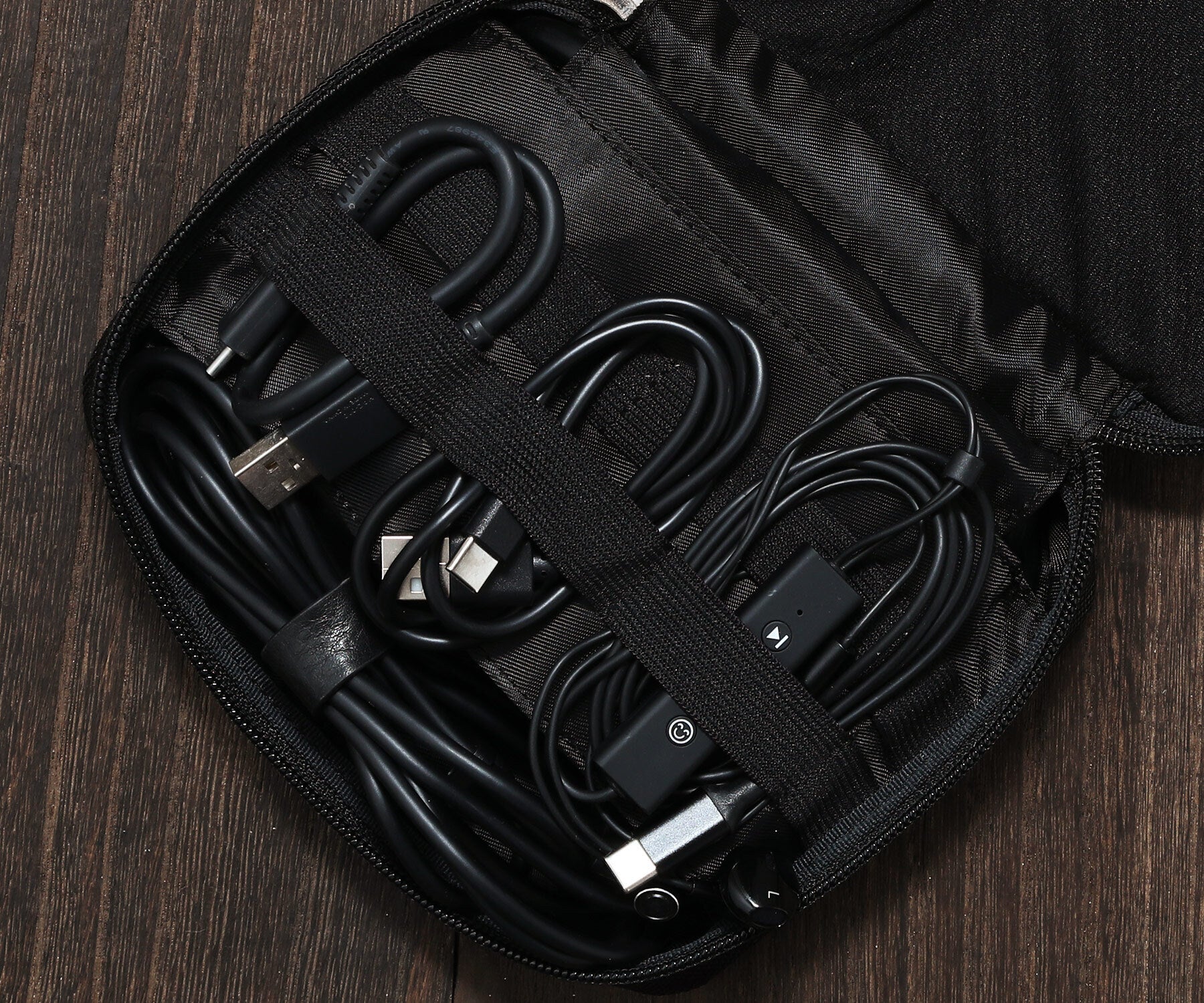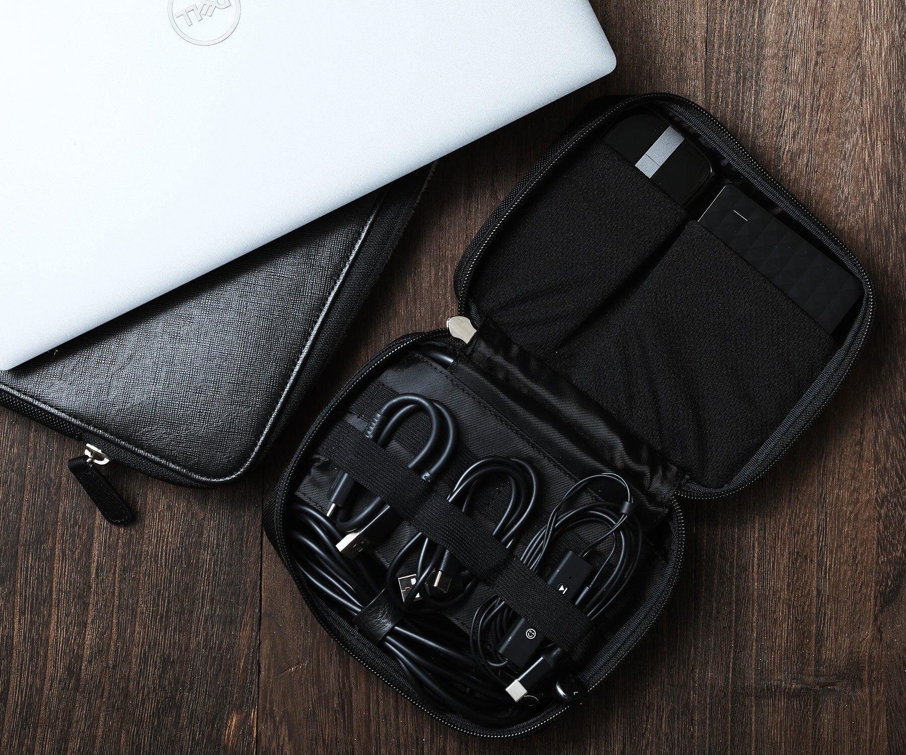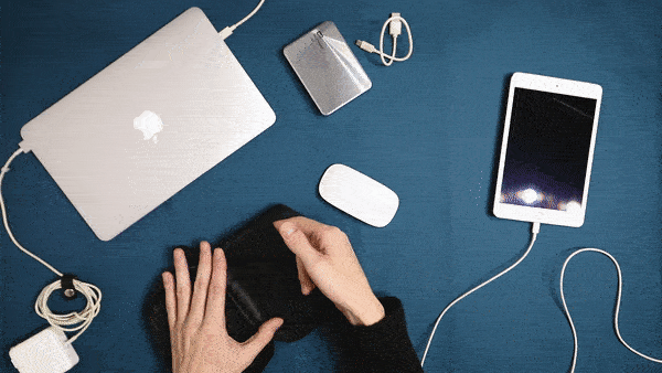 ポケットにはACアダプターを、伸縮性ストラップ内にはケーブルを整頓して収納していただけます。