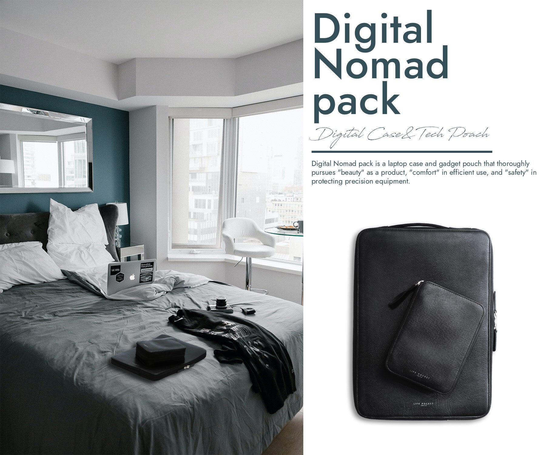Digital Nomad packは、プロダクトとしての「美しさ」、効率的に使うための「快適さ」、精密機器を守るための「安全性」を徹底的に追求したノートPCケース&ガジェットポーチです。