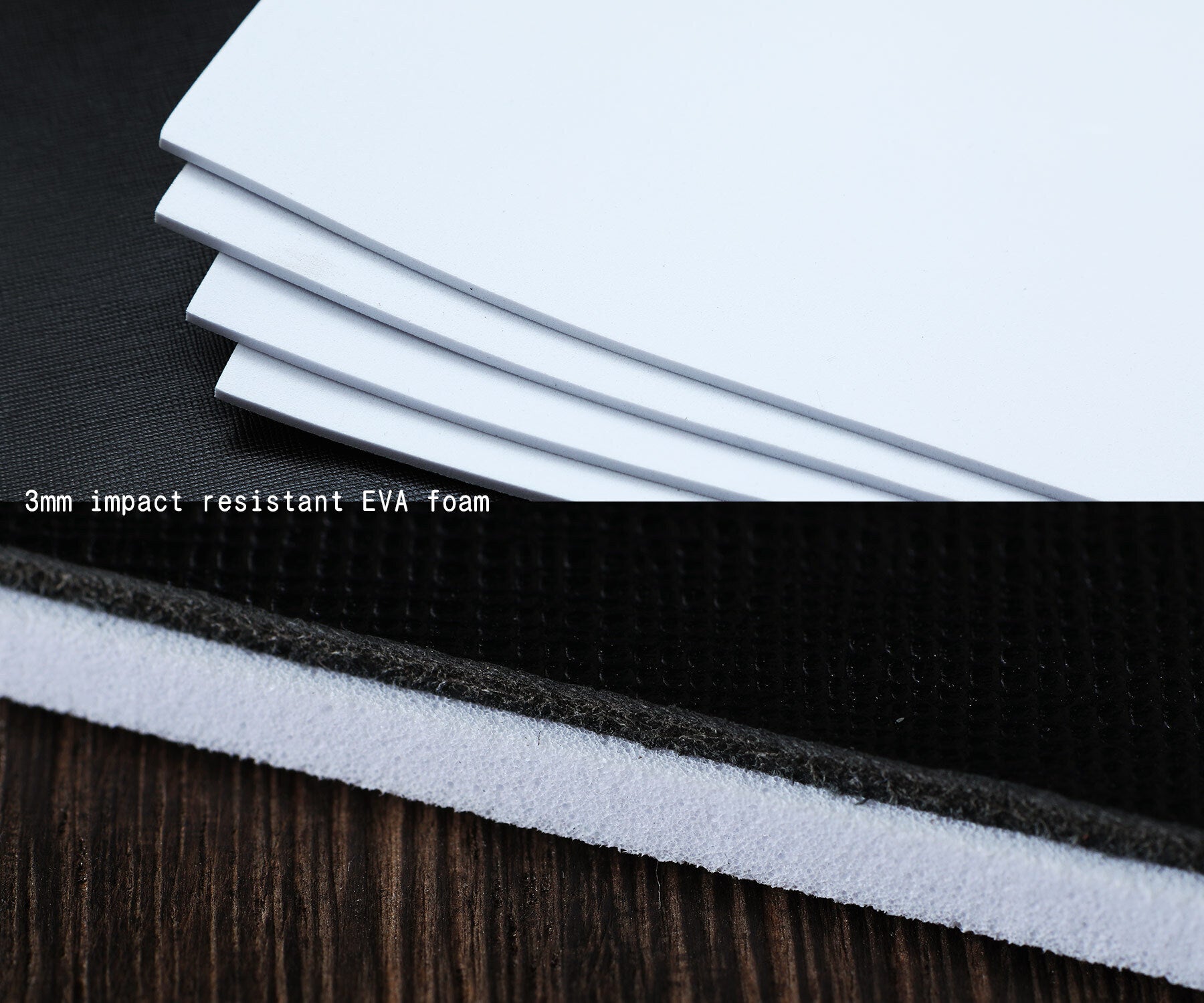 レザーとインナーの間には3mmの衝撃吸収材「EVAフォーム」を採用しました。ゴム弾性、柔軟性、強靭性、低温特性、耐候性など、多くの優れた特性を備えています。