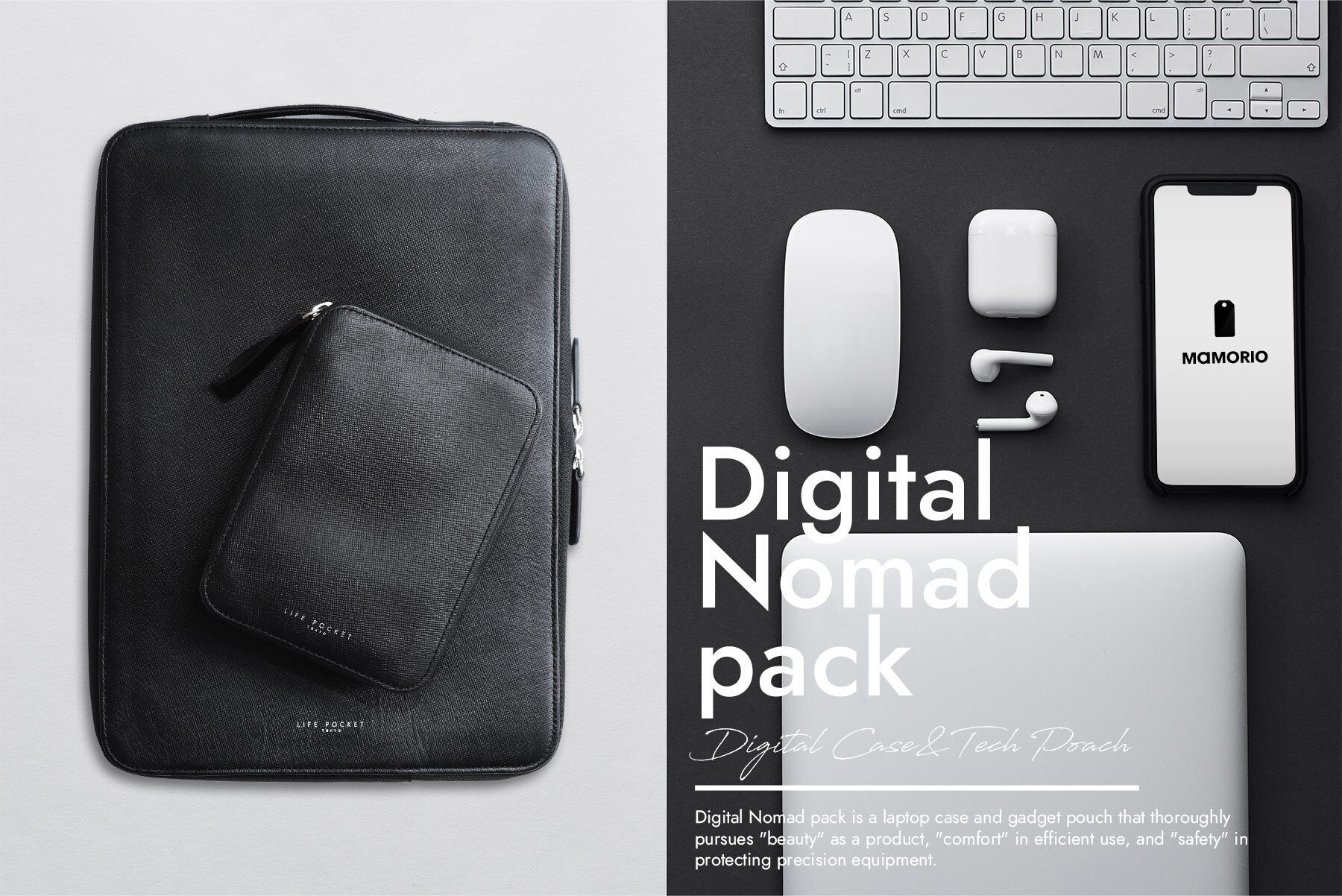 Digital Nomad packは、プロダクトとしての「美しさ」、効率的に使うための「快適さ」、精密機器を守るための「安全性」を追求したノートPCケース&ガジェットポーチです。