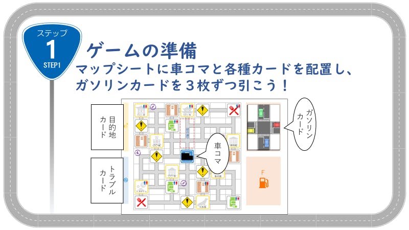 まずは、マップシートのP(パーキング)に車コマを、各種カードをそれぞれ下図のように置きます。