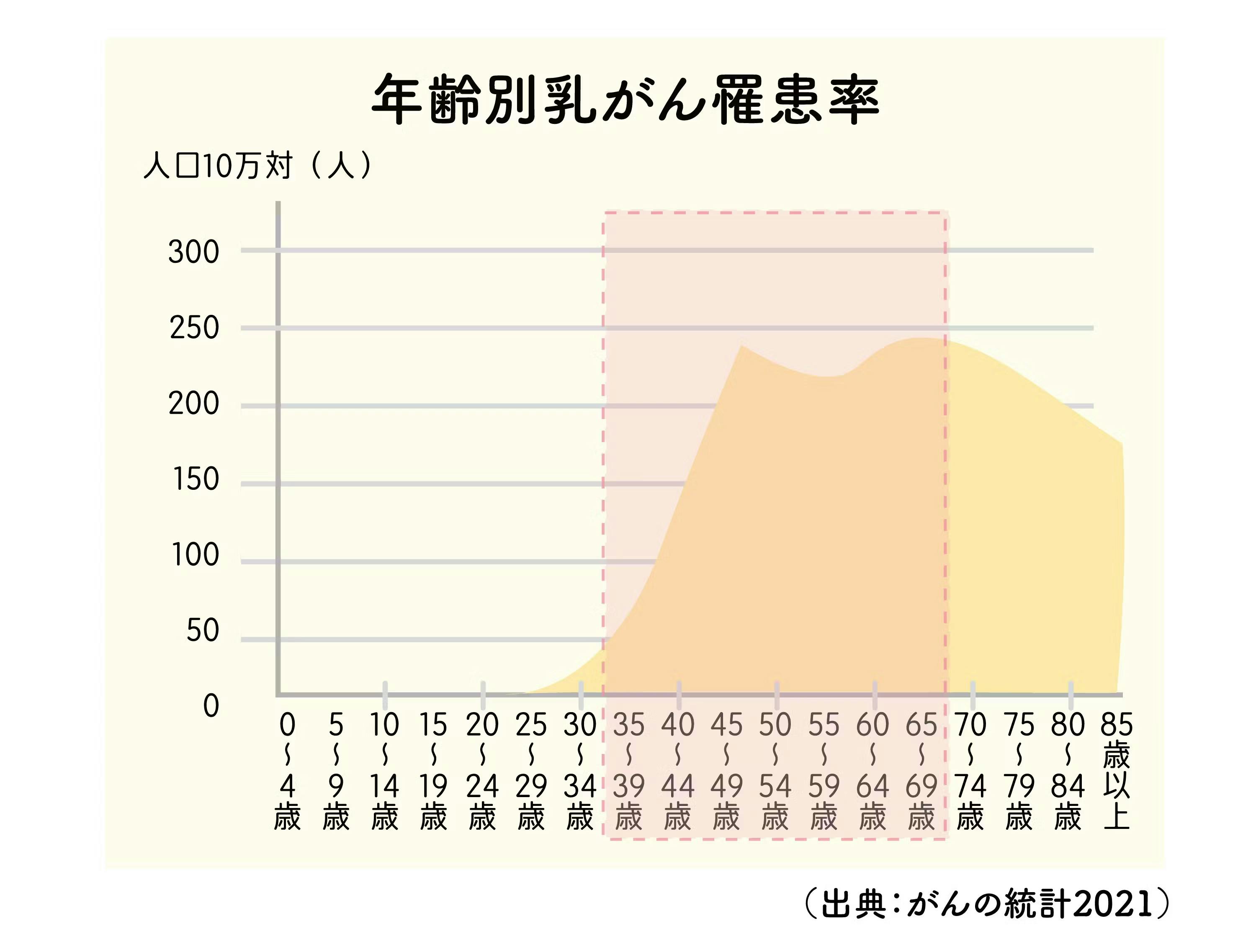 国の乳がん検診推奨年齢は40歳以上の女性ですが、30代から乳がん罹患リスクは上昇傾向になります。