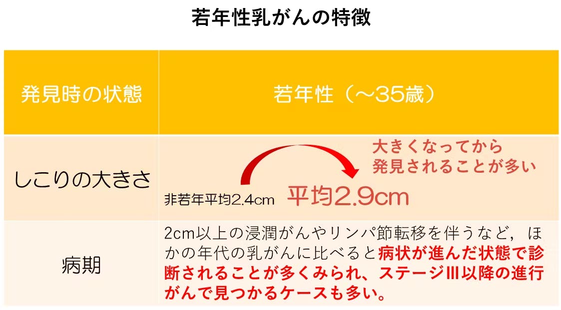 早期発見といわれるステージ0期とⅠ期で乳がんが発見される割合を見ても、35歳以上は80%なのに対し35歳未満は40%と低く、リンパ節への転移や腫瘍径が大きいなどのステージⅡ期やⅢ期で発見される割合が多くなっています。