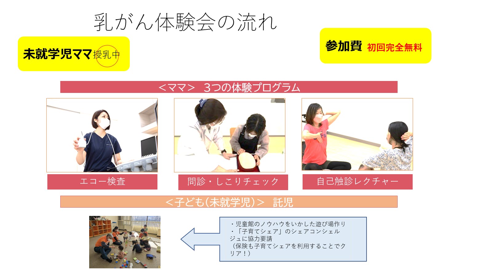 症状がないうち(0期、1期)に検診で発見されることが好ましく、そのためには定期的な検診がとても重要です。しかし子育て中でなかなか検診に行けないのも同じ子育て経験者として理解できるため、託児付の乳がん検診体験会の開催実施をしたいと考えています。