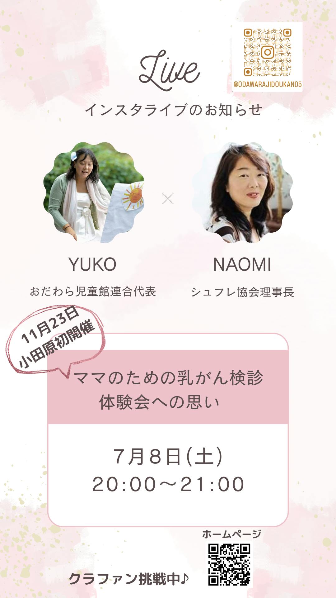 2023/07/01 10:00私どものページを見ていただき、ありがとうございます!今月いっぱいできる限りのことをしていきたいなと思っています。つきましては、この「ママのための乳がん検診体験会」を主催しているシュフレ協会の武次理事長とインスタ生ライブで対談し、この企画への思いなどを聞いていきたいと思います。また、当団体の思いも伝わるものにしたいなと思っています。インスタアカウント@odawarajidoukan05で検索!https://instagram.com/odawarajidoukan05?igshid=NGExMmI2YTkyZg==ぜひ、ちらっとだけでも覗きに来ていただけたら嬉しいです。周りの方にもシェアしていただけたらと思います、よろしくお願いします。 もっと見る