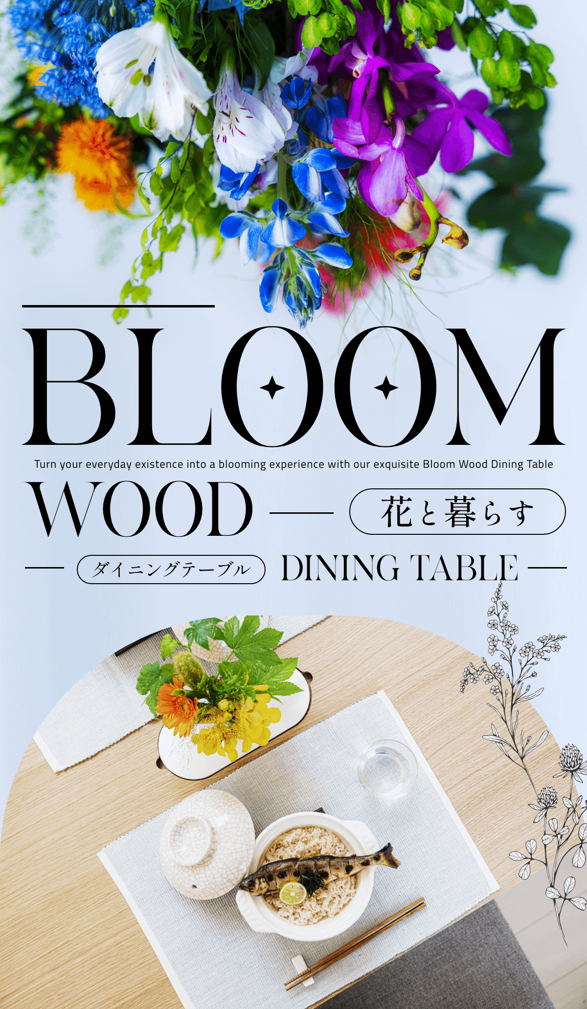 BLOOM WOODはダイニングでの日常のコミュニケーションに加え、花を添えることでより季節を感じ、行事や食文化を深く体験できます。また、日本食と和の花だけでなく、世界の行事や特別なイベントには海外の花を使用し、幅広い知識と文化を楽しめます。豊かな歴史と芸術の融合するテーブルで、心に響く瞬間を共有しましょう。