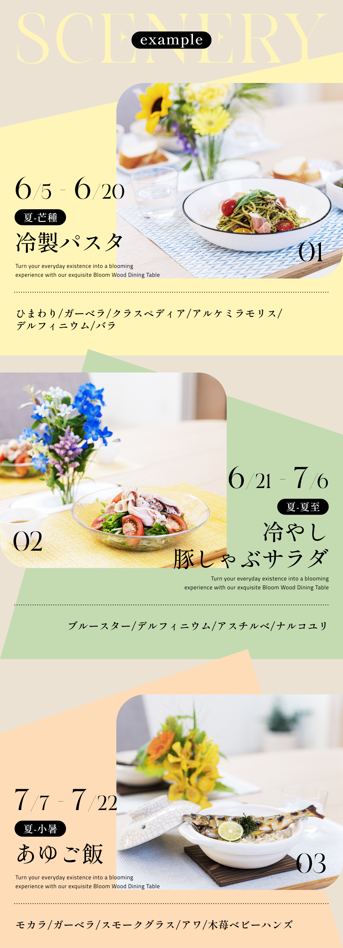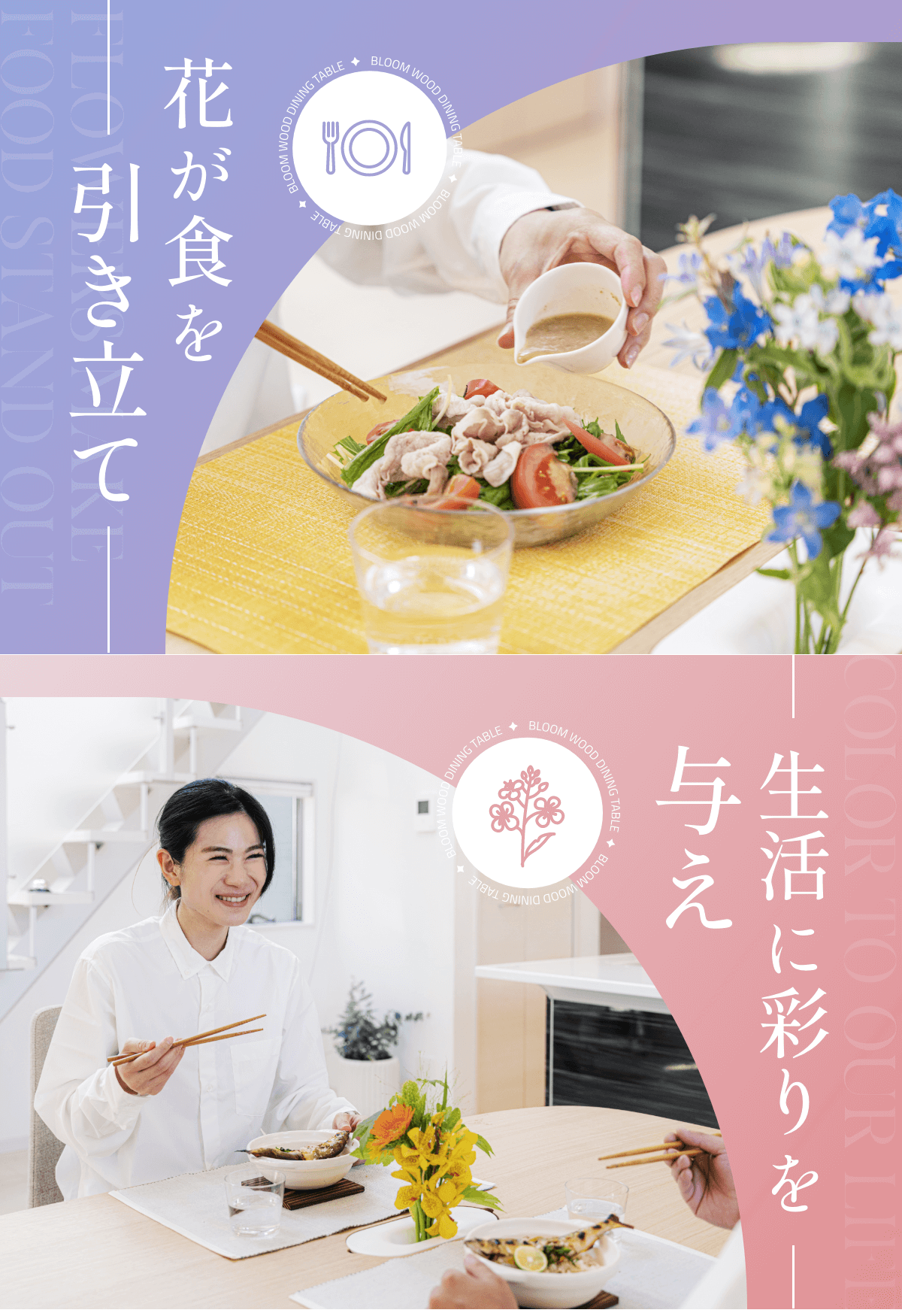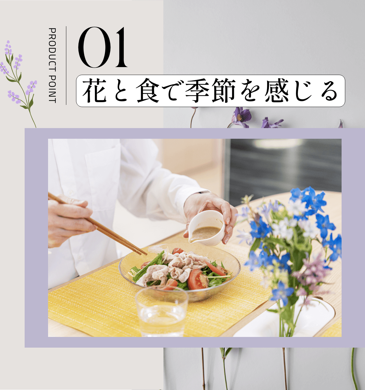 従来の食事シーンでは、人と食と花の調和が乱れていました。これまでは花が適切に活用されず、バランスが欠けていました。