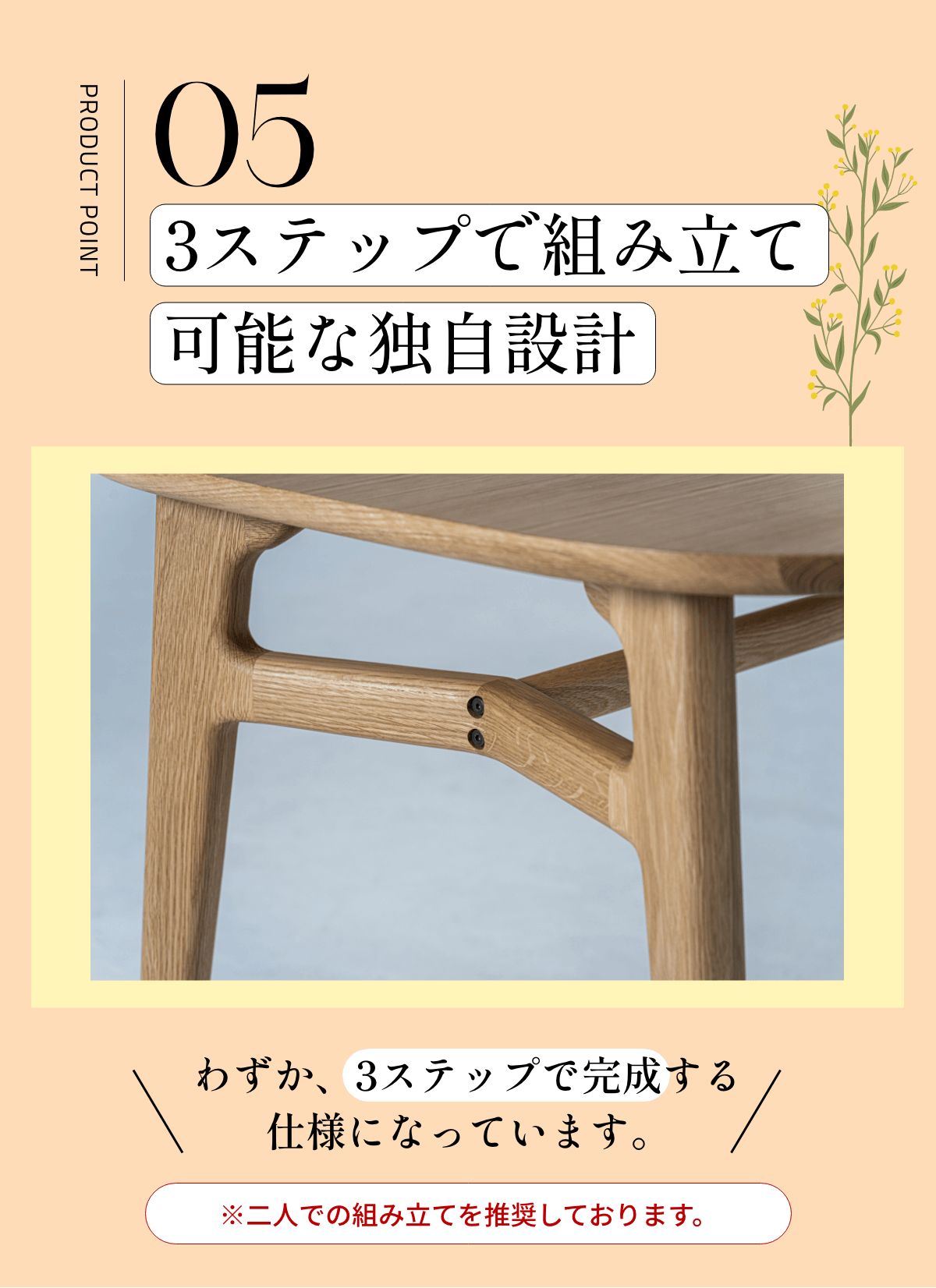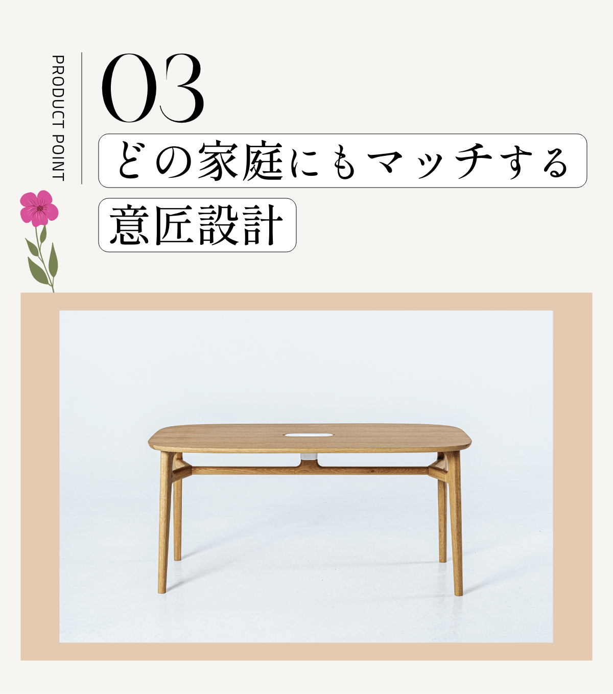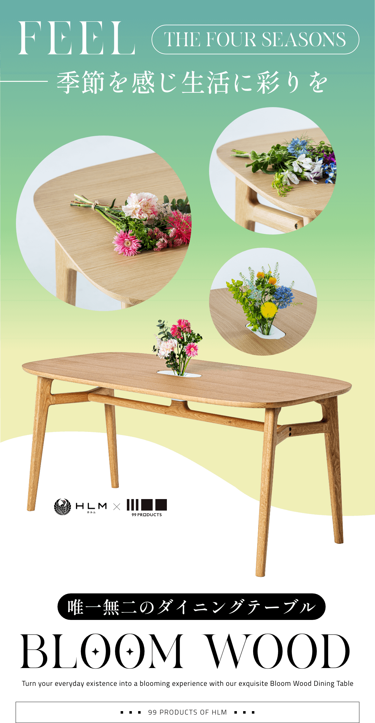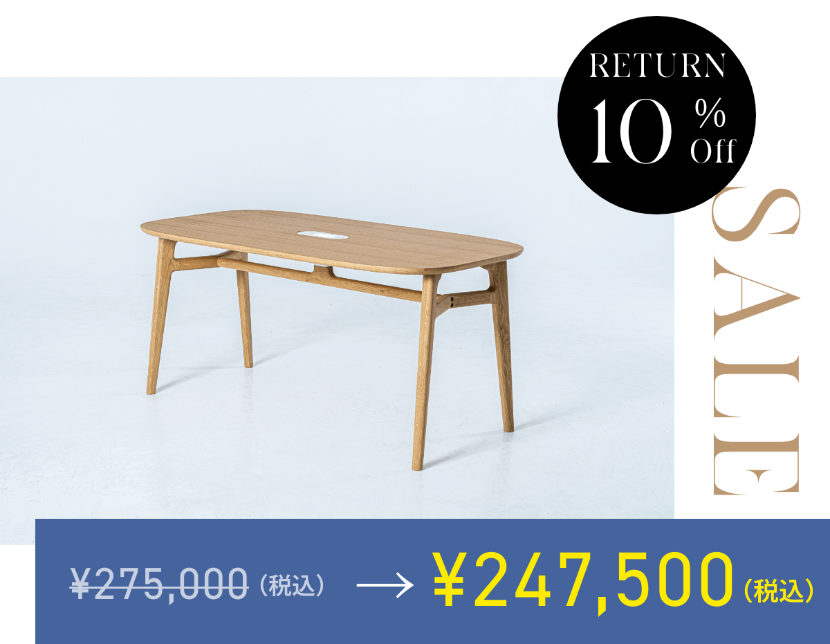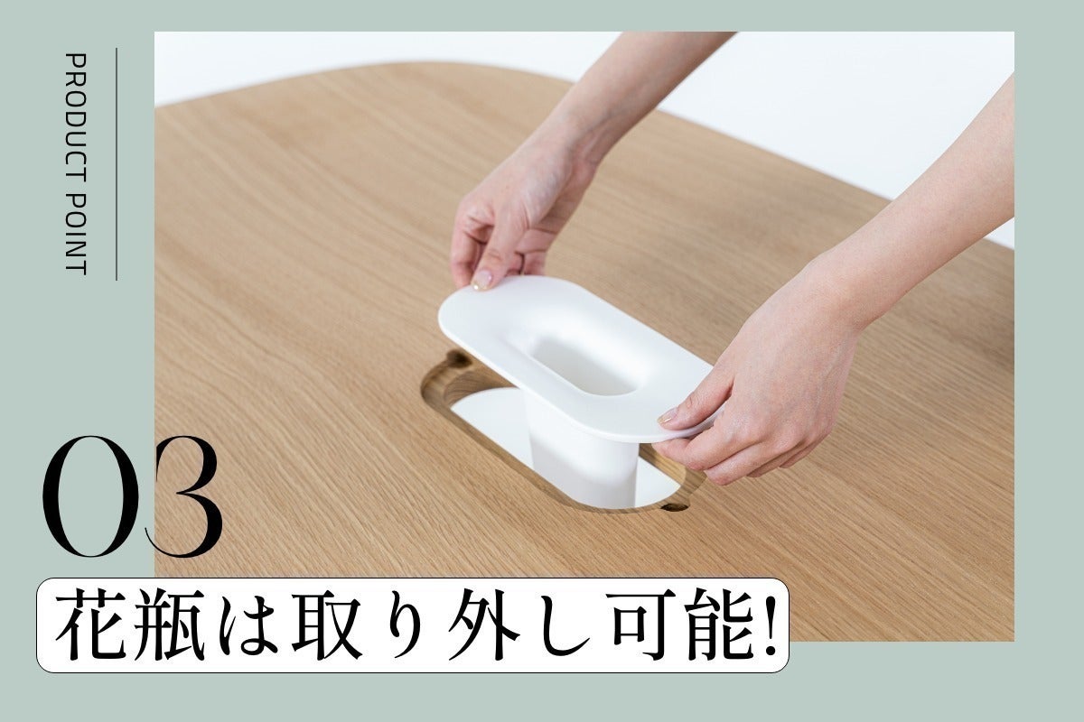 私たちは「自然と調和した生活を。」という想いを込めて、花瓶のあるダイニングテーブルを制作しました。季節の花を飾ることで、ダイニングに美しさと四季が生まれます。このテーブルを通じて、人と食と花の調和を整え、人々の日常をより豊かで充実したものに変えることを目指しています。