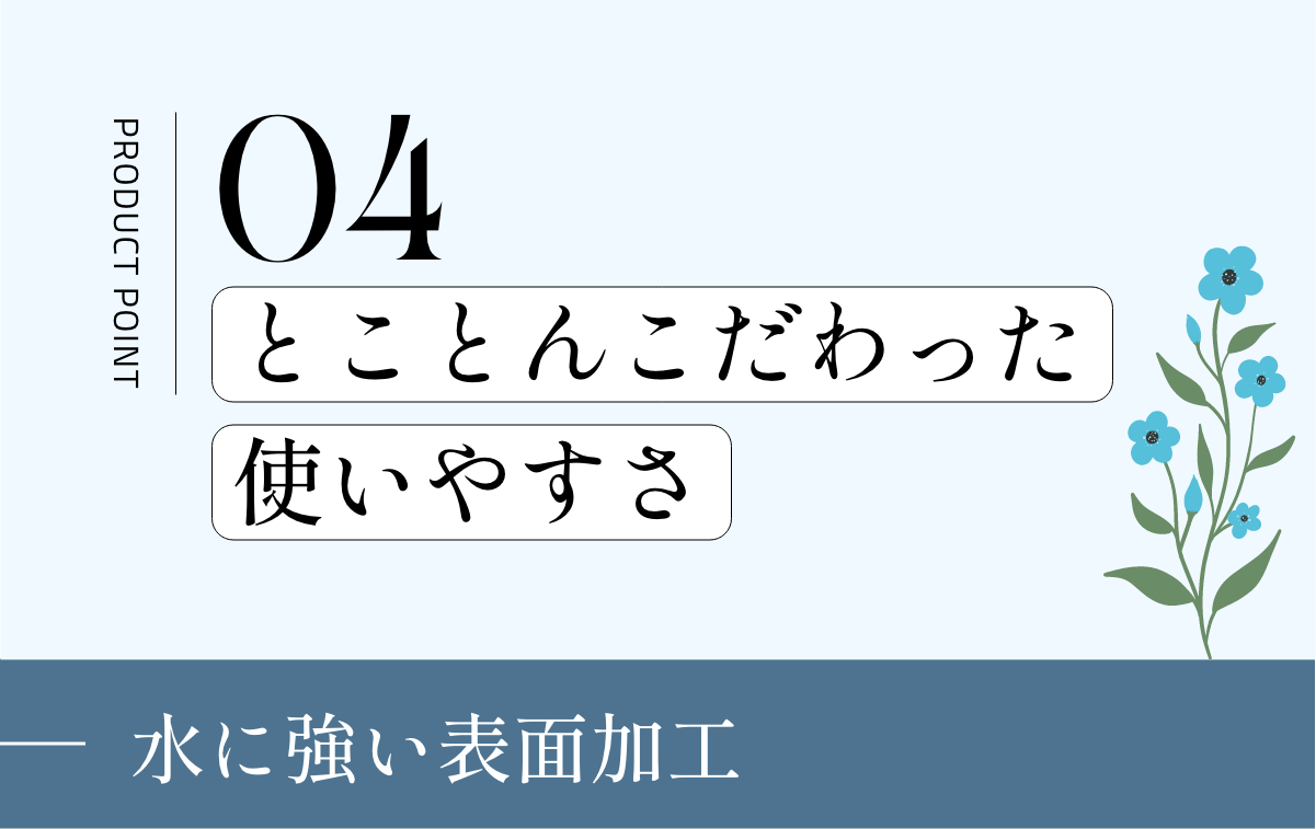 天板にはウレタン塗装を採用しているので、水や熱に強く、メンテナンスの必要もありません。また、ウレタン塗装ながら、輝度を抑えた仕上げに調整をしていて、ウレタン塗装独特のテカテカとした仕上げにせず、落ち着いたマット感を感じられる様に仕上げています。温かな木の風合いを最大限残す工夫をしながら、手のかからない利便性も実現しています。