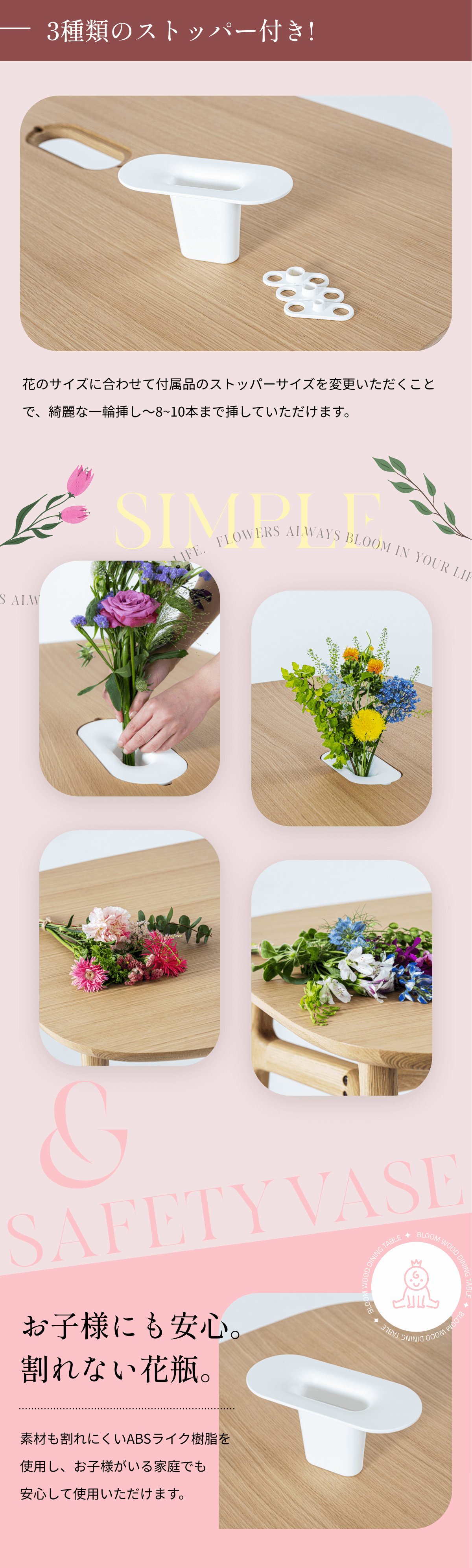 A:花瓶は樹脂素材を使用しているため、軽量かつ割れにくくなっています。小さなお子様がいる家庭でも安心して使っていただけます。