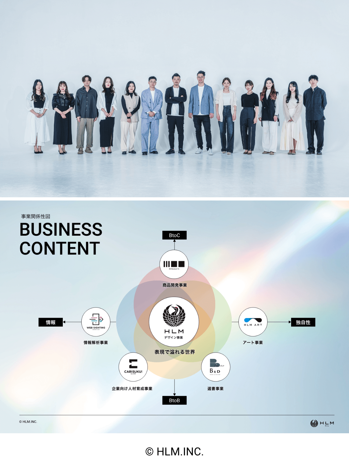 株式会社HLMは、「表現が溢れる世界はきっと面白い」というコンセプトのもと、多角的な事業展開を行うデザイン会社です。コミュニケーションに焦点を当てた取り組みを通じて、革新的なアイデアを生み出しています。これは事業展開の延長線上にあるものであり、HLMが本質的なデザイン会社に辿り着くための考え方です。その全てが最大化し、繋がっていく中でHLMは新しい形になっていきます。