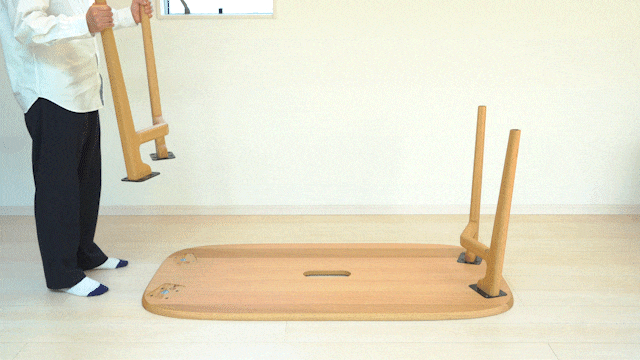 ①天板と脚部を開封し天板に脚部を取り付け、付属のネジを六角レンジでしっかりと固定します。