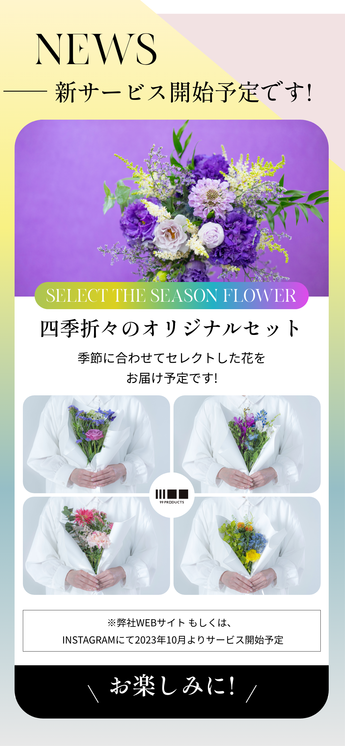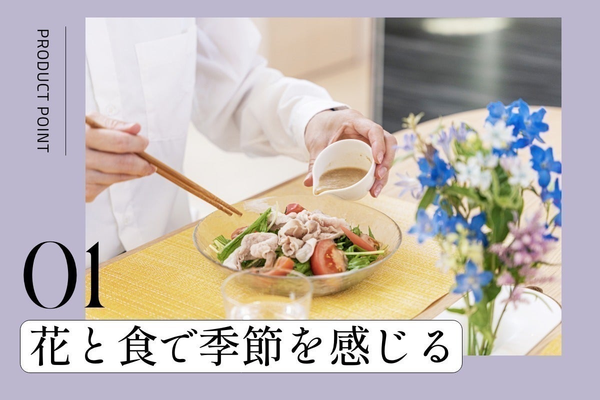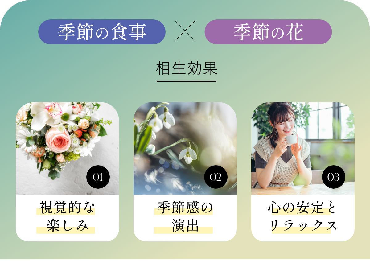 食材の旬や花の開花時期を知ることで、自然のリズムと調和した食事と花の組み合わせが実現します。その結果、食卓には自然の美しさが溢れ、視覚的にも楽しめる空間が生まれ、食と花で季節を感じることができます。