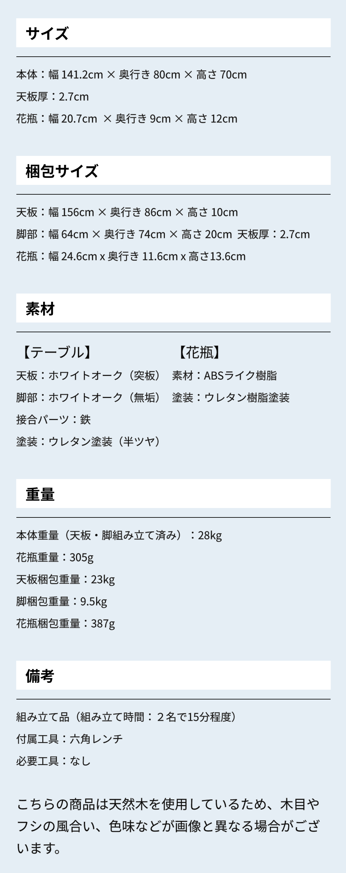 A:安全性を考慮し、天板と脚部と花瓶の3つに分けて梱包する予定です。天板はどうしても重量があるため2名での受け取りを推奨しています。到着後、天板と脚部を開封し組み立てをお願い致します。