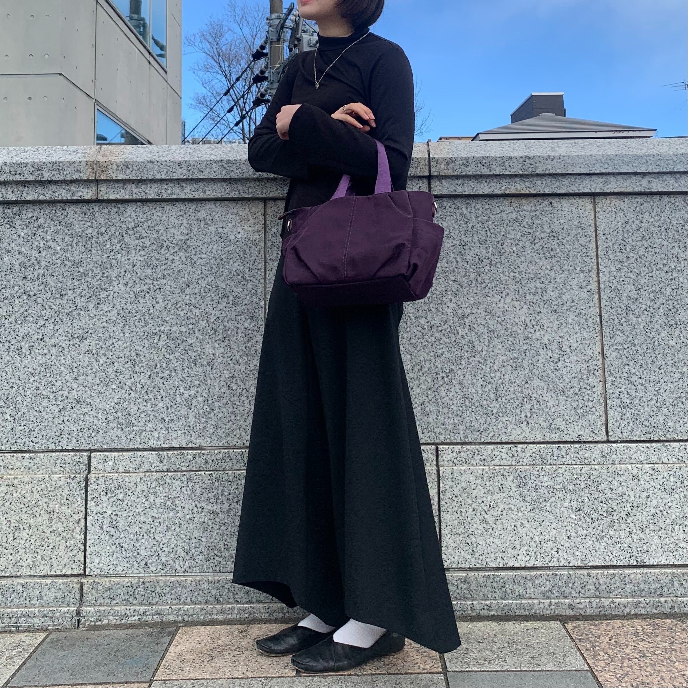 バッグを置いている時もスマートにみえるよう、ハリ感のある生地を使用して、自立するようにしました。