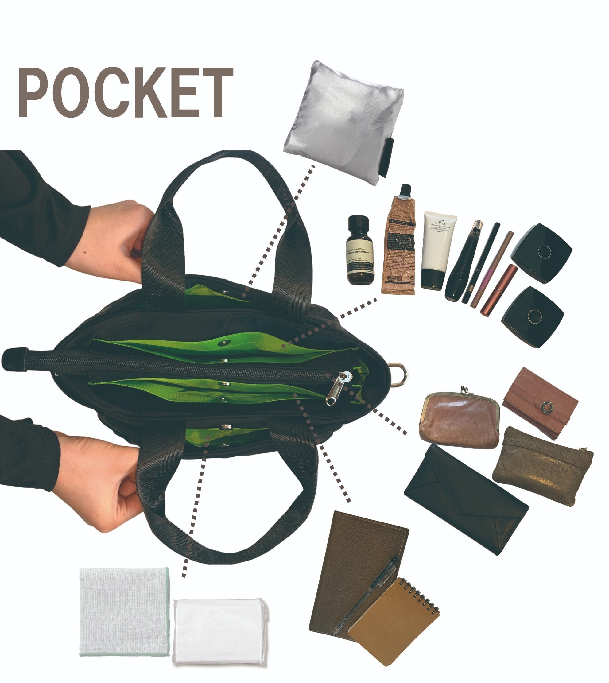 ここにはエコバッグ、ここには化粧品類、ここには手帳、ここにはティッシュやハンカチ…など、