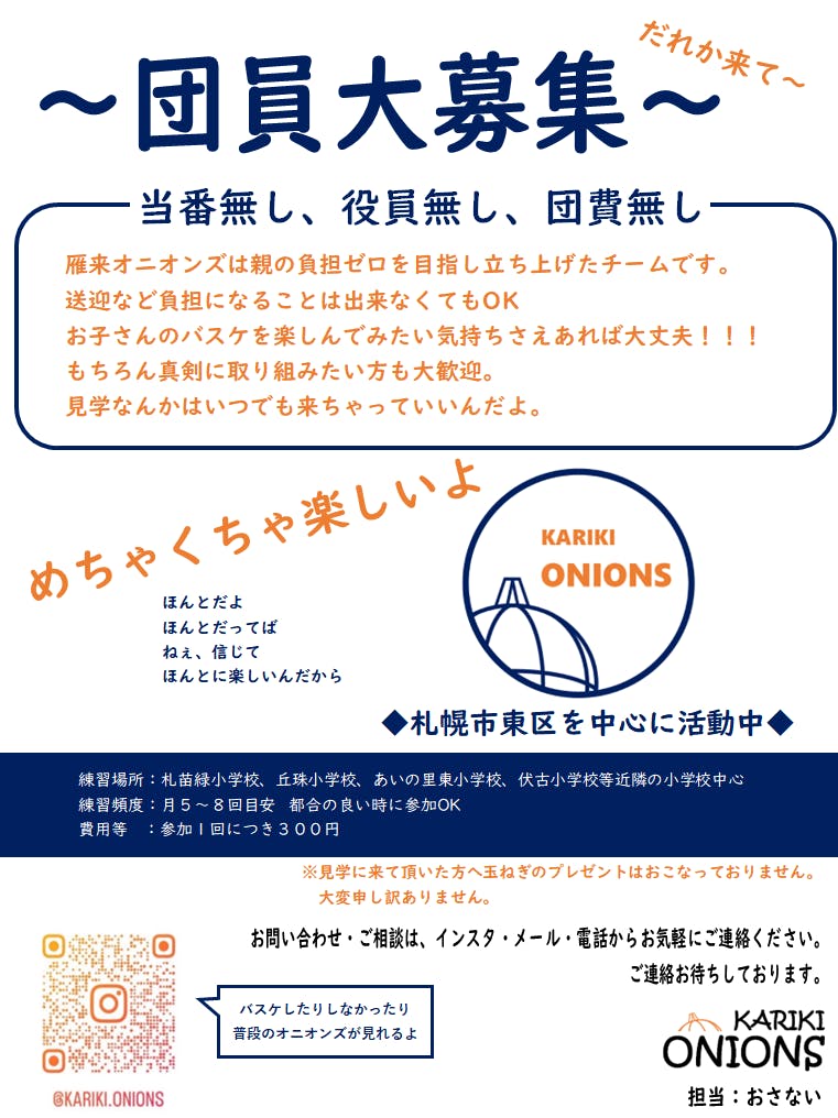 札幌市東区を拠点に活動している男子ミニバスケットボールチーム【雁来オニオンズ】コーチの小山内(おさない)と申します。