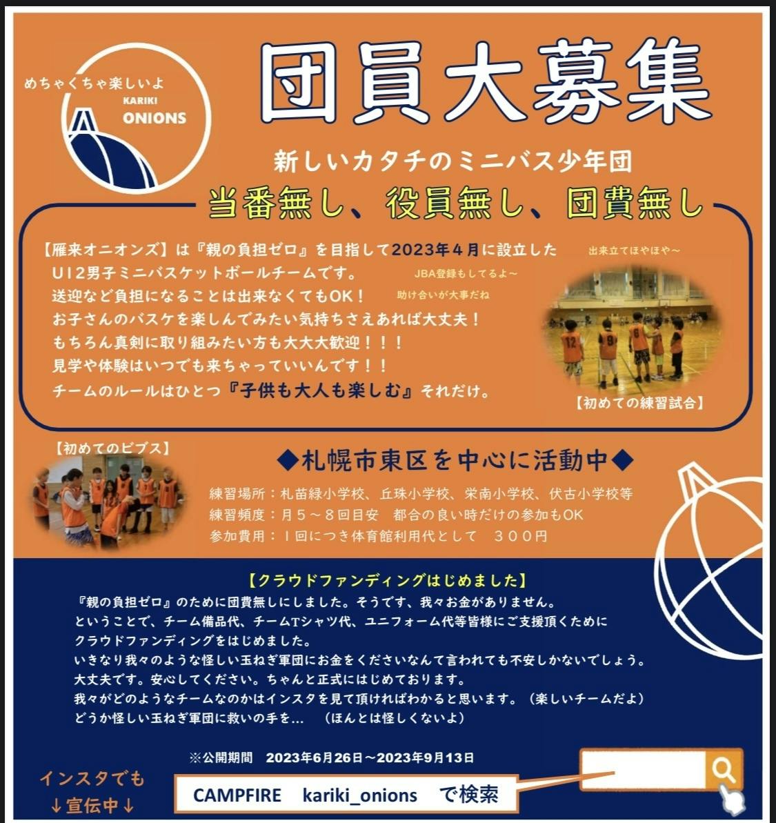 2023/07/12 12:17こんにちは!雁来オニオンズの通称ボスです。先日、初めての体験会というものを行いました。3人参加して頂き、そのまま仲間入りしてくれました。ありがと〜約3ヶ月前、心をポッキリと折られた僕とバスケがしたかった息子。もう進むしか道がなかった僕らを信じて着いてきてくれた7人の子供達と親御さん達。最初はどうなるかわからなかったチーム作りですが、今は少しづつ、しっかりと前に進んでいるような気がします。でも少しだけ、あの少人数の頃が懐かしくもあります。この前の練習に仕事で遅れて行った際、大勢の人間達を見てふと思いました。『あれ?体育館間違えた?』そんなことはなく、紛れもなく大勢のオニオンズでした。まだ、3ヶ月しか経っていないということが不思議でなりません。もう半年、いや一年くらい一緒にいるような気持ちです。今では子供達が15〜18人位になりました。正式に入団という形をとっていない為、正確なメンバーの数がわかりません。毎回のように練習に来る子、月1回来る子、友達がいるから来る子、ほぼ来ない子、参加理由はその子次第、参加頻度もその子次第でいいと思ってます。ただ、バスケがしたい。オニオンズにまた行きたい。一度でもそのように思ってくれる子はオニオンズの仲間です。そしてそんな子が1人でも多く増えることを願っております。長くなってしまいましたが、オニオンズメンバーが増えておじさんはニヤニヤしているよという報告でした。こんなチームですがどうかご支援よろしくお願い致します。 もっと見る