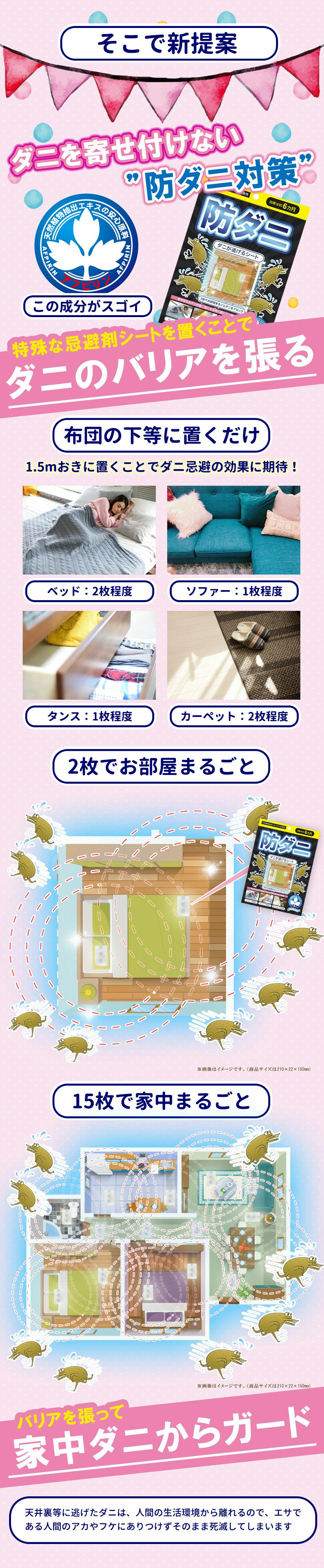 使用上のご注意:本製品はダニの駆除を目的としたものではありません。使用環境、条件等により効果には差があります。本製品を生体に使用したり、本製品の上に直に寝たりしないでください。床などに使用したシートに乗ると滑ることがありますので十分ご注意ください。直射日光が当たる場所でのご使用、保管はしないでください。効果が落ちる場合があります。乳幼児の手の届く所に置かないでください。防ダニ成分は人体には無害ですが、万一目や口に入った場合は必要に応じて医師の診断を受けてください。火気の近くや高温になる場所、濡れる場所ではご使用、保管しないでください。他の防虫剤とは併用しないでください。シートは洗わないでください。湿った時は陰干しをして乾燥させてからご使用ください。乾燥機やアイロンは使用しないでください。著しく破損したり、汚れたものは使用しないでください。シートは使い捨てです。再利用はできません。用途以外の目的では使用しないでください。