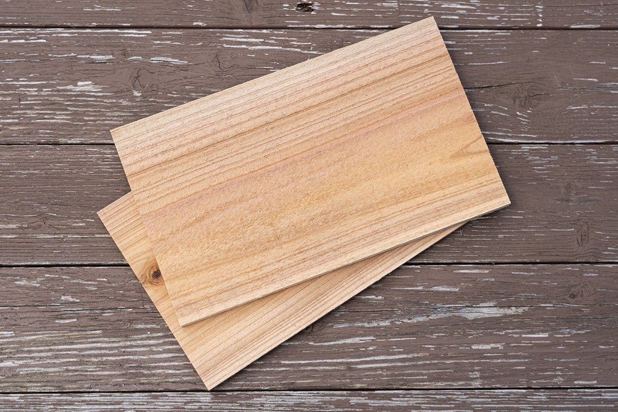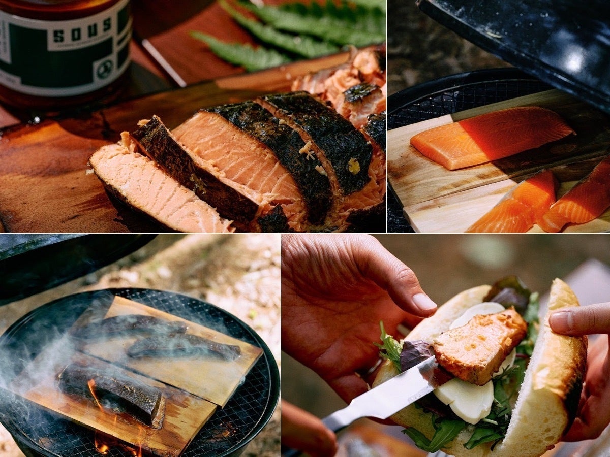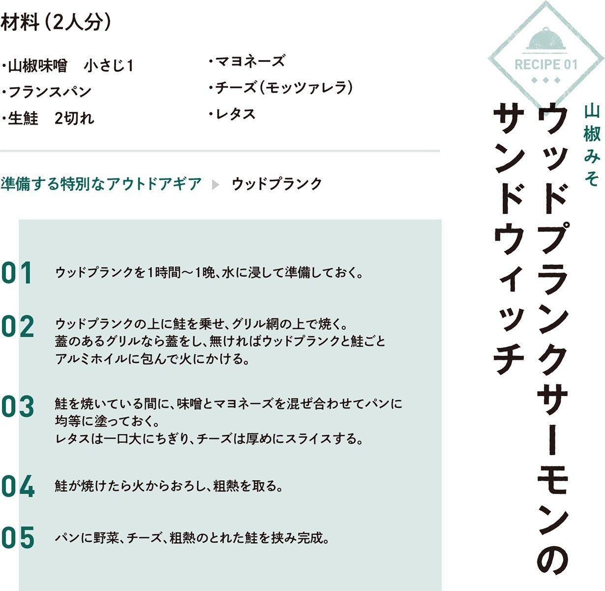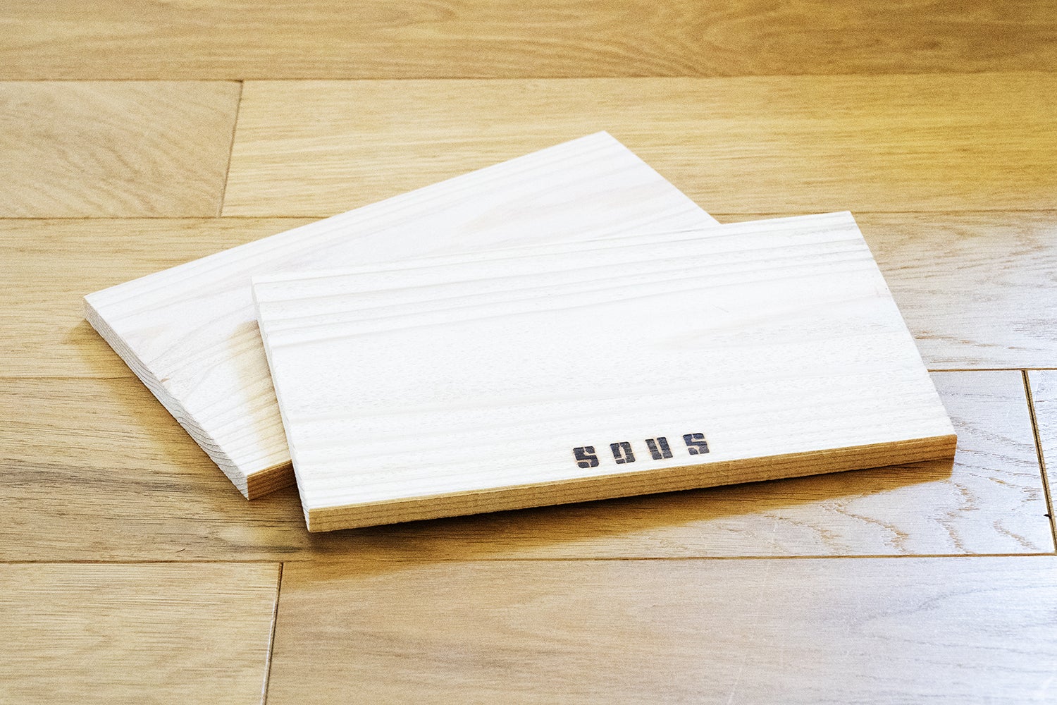 SOUSレシピにて紹介した、ウッドプランクサーモンのサンドウィッチに使用していたウッドプランクもご用意しました。天然杉材のウッドプランクは香り高く、肉にも魚にもご使用いただけます。また、何かと忘れ物が多いキャンプにおいて、サブまな板やスキレットの鍋敷き等としても活躍します。
