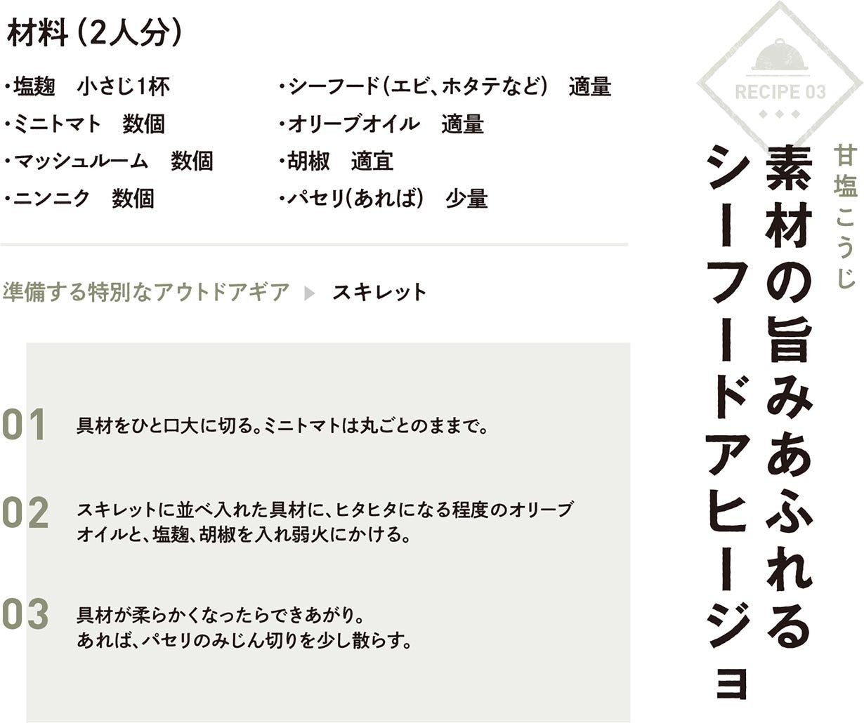 また、食べる瞬間はもちろんですが、作る過程のライブ感も含めてキャンプ飯というもの。ここでは過程も含めて盛り上がる、超簡単(でも仕上がりは手が込んでそうに見える)なSOUSレシピをご紹介します。