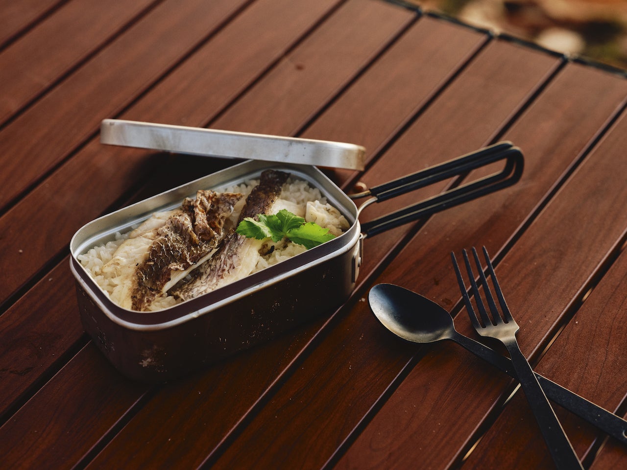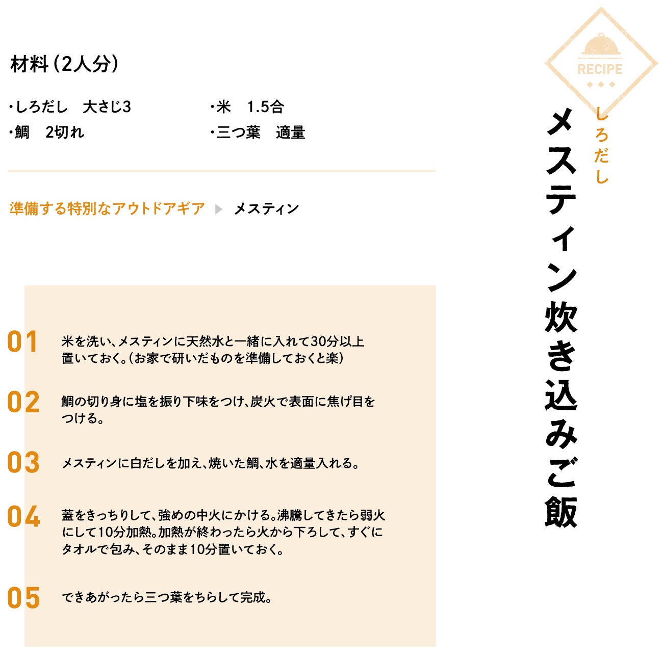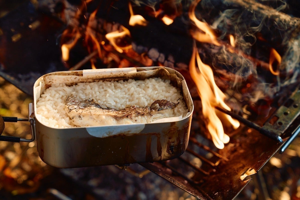 おすすめなのは、汁物や炊き込みご飯。いつものメスティンご飯の作り方に、しろだしをプラスするだけで、魚の旨味が広がる美味しい炊き込みご飯に仕上がります。水は少なめにしておくのがコツです。