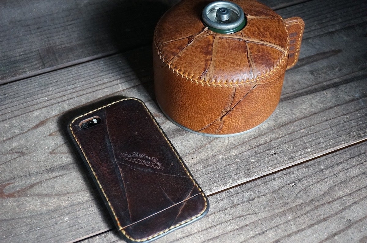 レザーといえば経年変化。隣にあるスマホカバーは同色のコニャックカラーが経年変化したものです。はじめは明るい茶色ですが、時間とともに奥深い色味に変化し、ツヤも増していきます。アキャブレザーならではの切れ込みも同様に経年変化していきます。「キャンプのツレ」として一緒に時間を過ごしていただきたいと思います。