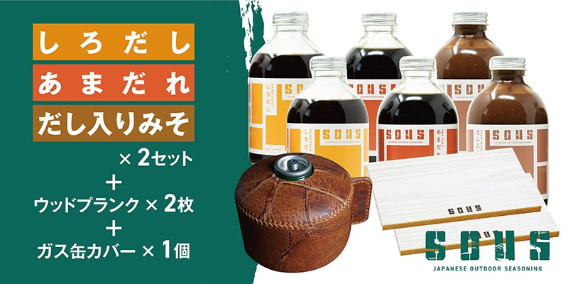 しろだし、あまだれ、だし入りみそ それぞれ2個、ウッドプランク2個、ガスカードリッジレザーカバー1個のセットです。