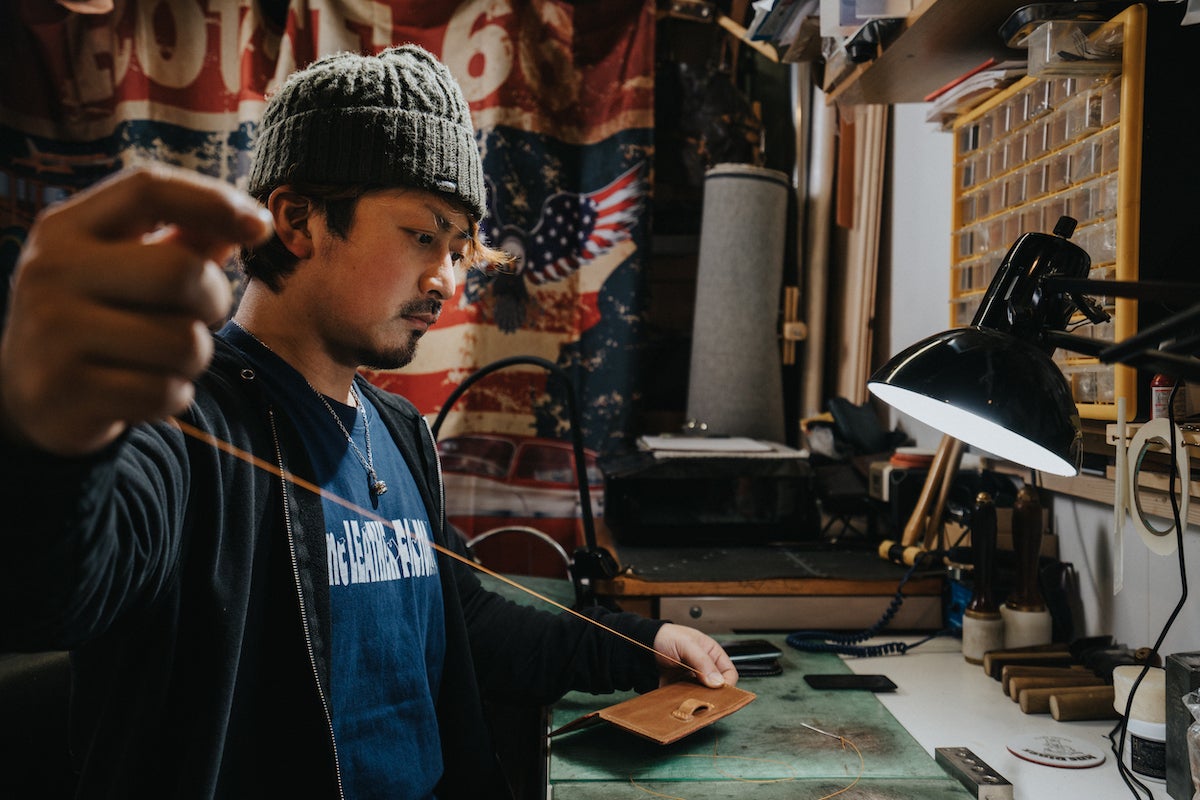 製作にご協力いただいたのは、秋田県にかほ市 knc Leather Factory の木内 正信さん。手縫いにこだわり、オールハンドメイドで素敵なアイテムを作り続けています。