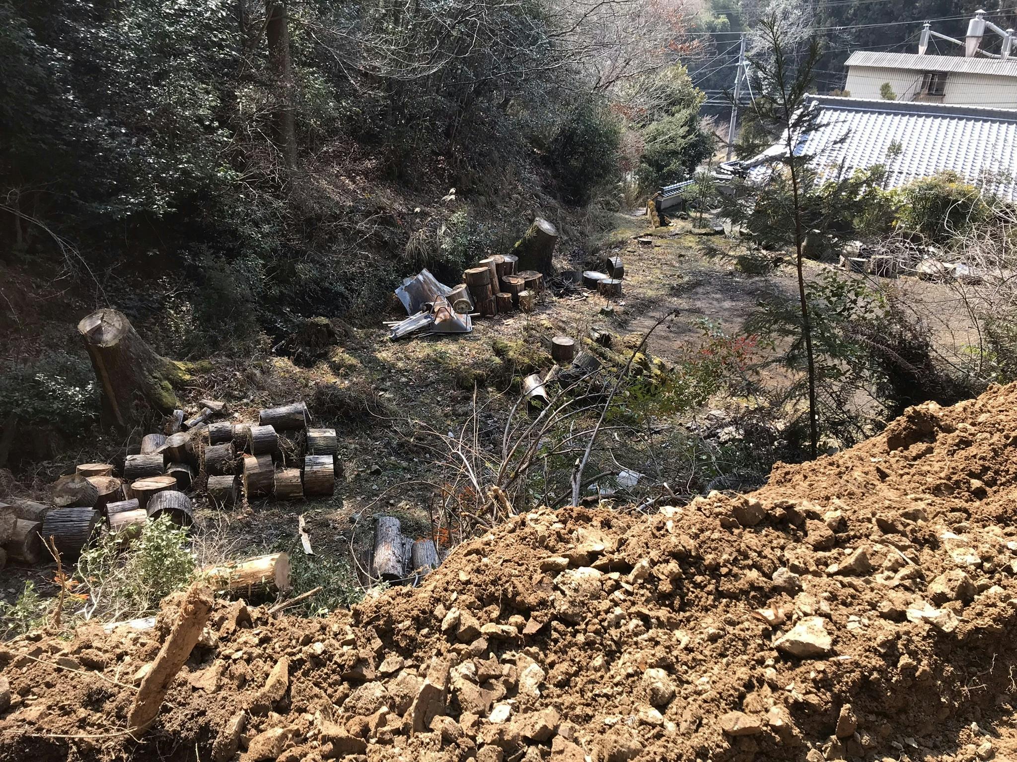 1. 作業道の整備を行っており、概ね8割程度完成しております。当初は作業道なしで工事を進める予定でしたが、小さい建物とは言え色々と搬入や作業上必要と判断し、本体工事以前に作業を進めております。