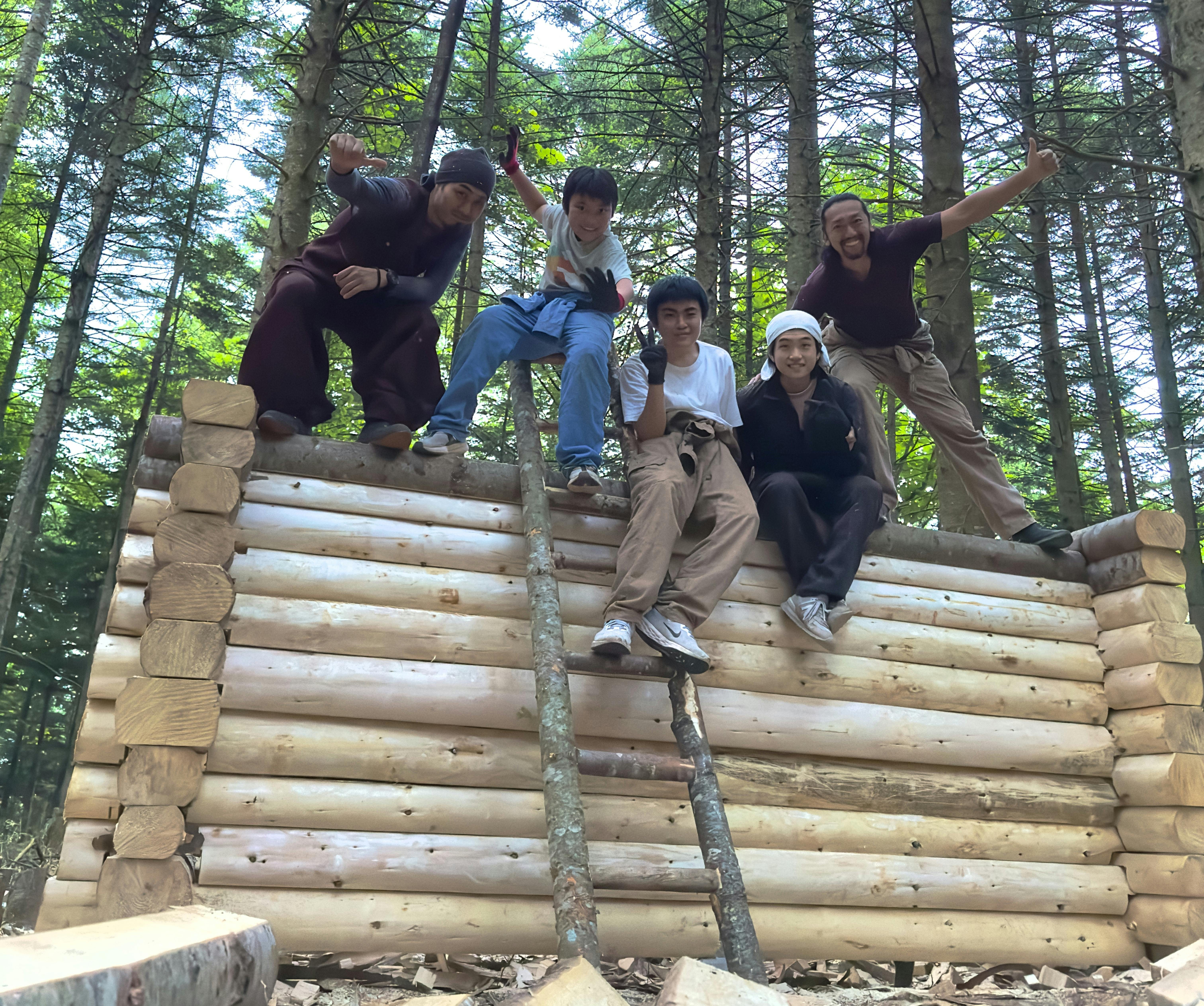 製材した丸太を、森の中に運び込み、積み上げ、木同士がしっかりと組むようにノミで削る、と肉体を使っての作業となりました。