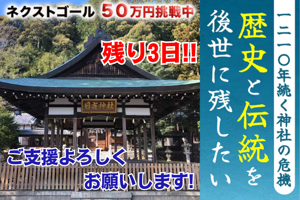 2023/07/27 13:36こんにちは!いつも応援、アクセスありがとうございます。また、ご支援下さいました皆さまありがとうございます。クラウドファンディングも残すところあと3日を切ってしまいました。これまで多大なるご支援をいただき、ファーストゴール目標金額の30万円を達成することができ、現在ネクストゴールの50万円を目指し活動を継続中であります。日吉神社の存続のために、是非とも拡散頂き、更なるご支援を賜れますと幸いです。 残り3日まだまだネクストゴールに向かってあきらめず頑張りますので、引き続きご支援・応援・拡散をよろしくお願いいたします!!! もっと見る