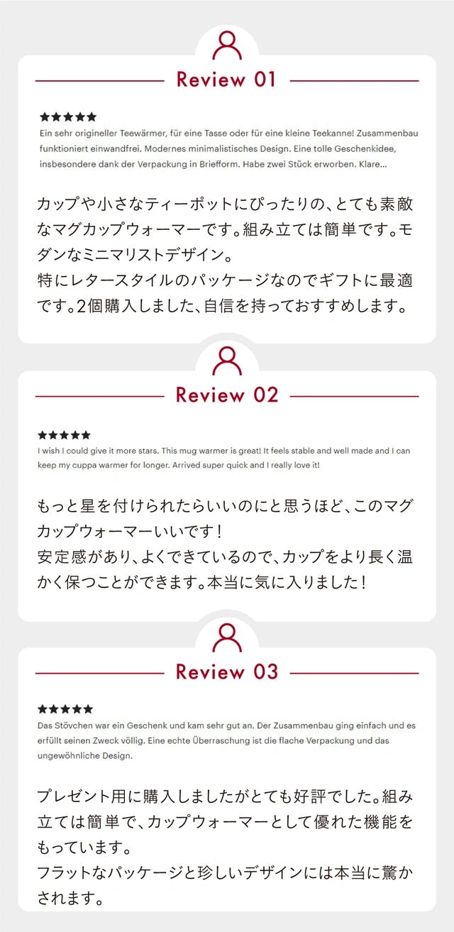 耐熱性のあるステンレスや陶磁器のマグカップにコーヒーやお茶を淹れ、ティーライトキャンドルで温めれば、ティーライトキャンドルの火が消えるまで約4時間程度は中のドリンクが温かいまま。※