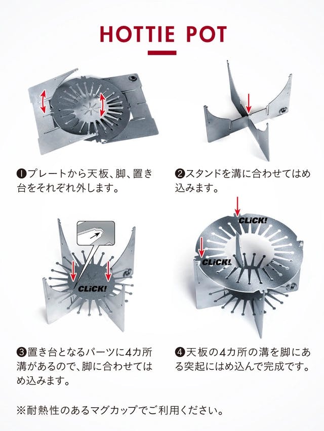 HOTTIE POTは1枚のステンレスシートでお届けします。それぞれのパーツはプラモデルと同じように簡単に取り外せ、たった1分で組み立て完了。ニッパーや接着剤も必要ありません。また使用後に汚れてしまっても、ステンレス製なので水洗いが出来てお手入れも簡単です。