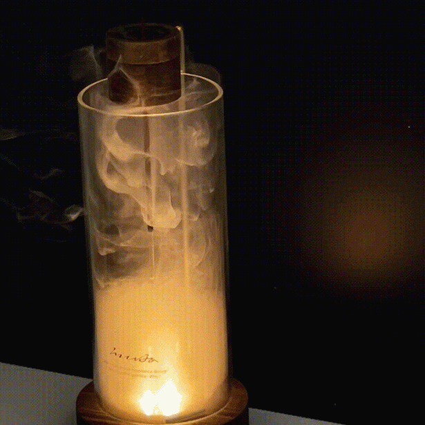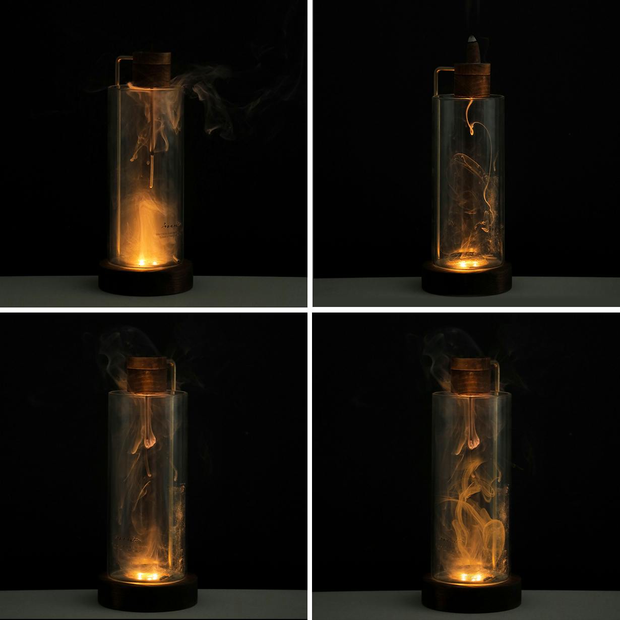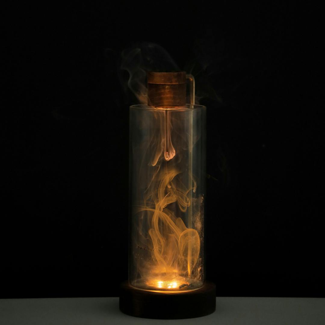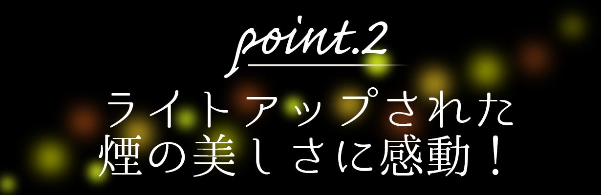 ガラスの中を煙が揺らめく様子を下からライトで照らすと、煙の動きの美しさ、繊細さに見とれてしまいます。
