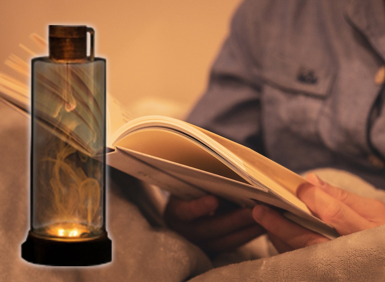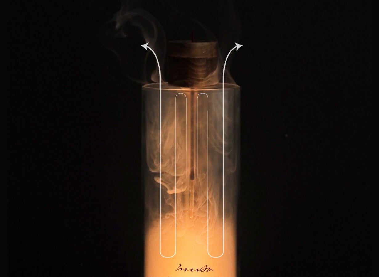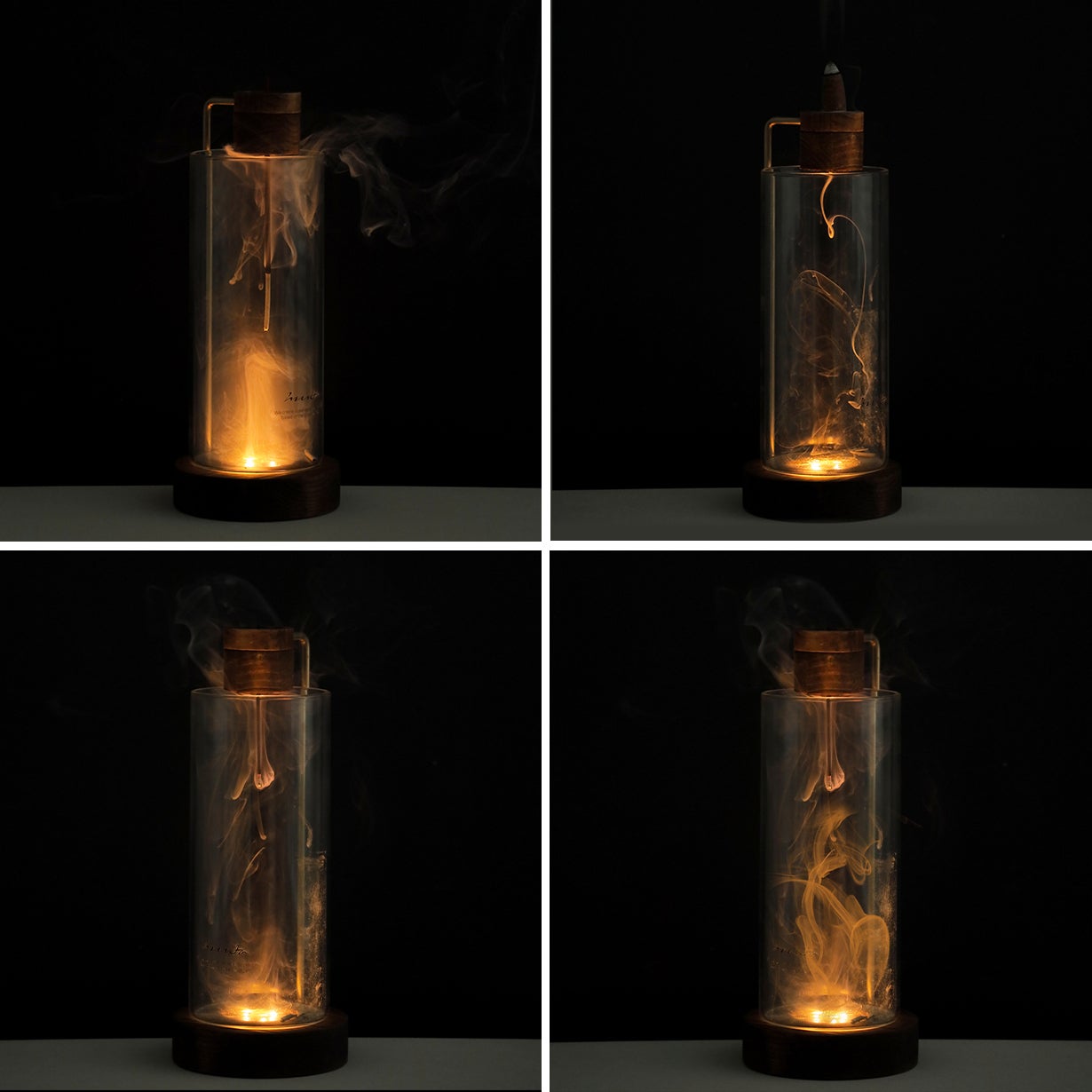 ガラスの中を煙が揺らめく様子を下からライトで照らすと、煙の動きの美しさ、繊細さに見とれてしまいます。