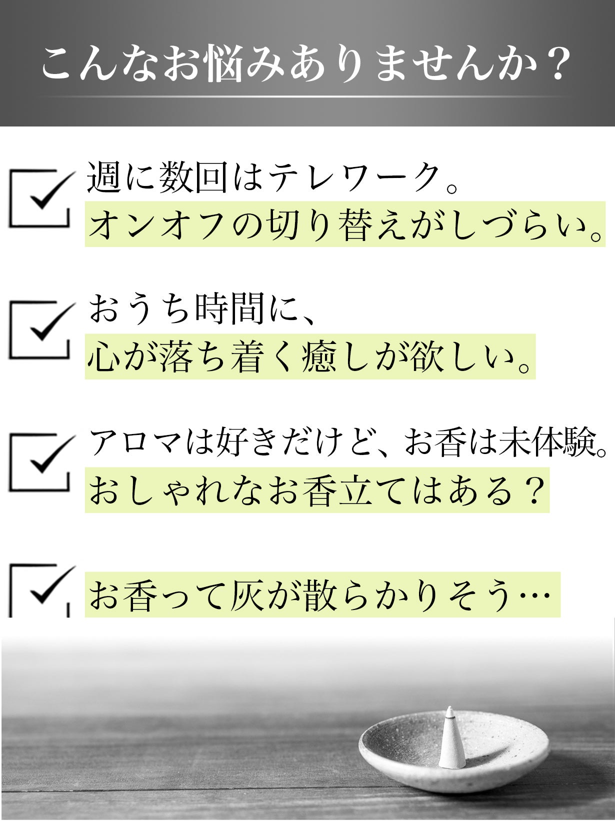 「お気に入りの香りを焚くと、仕事が終わったことを実感!」