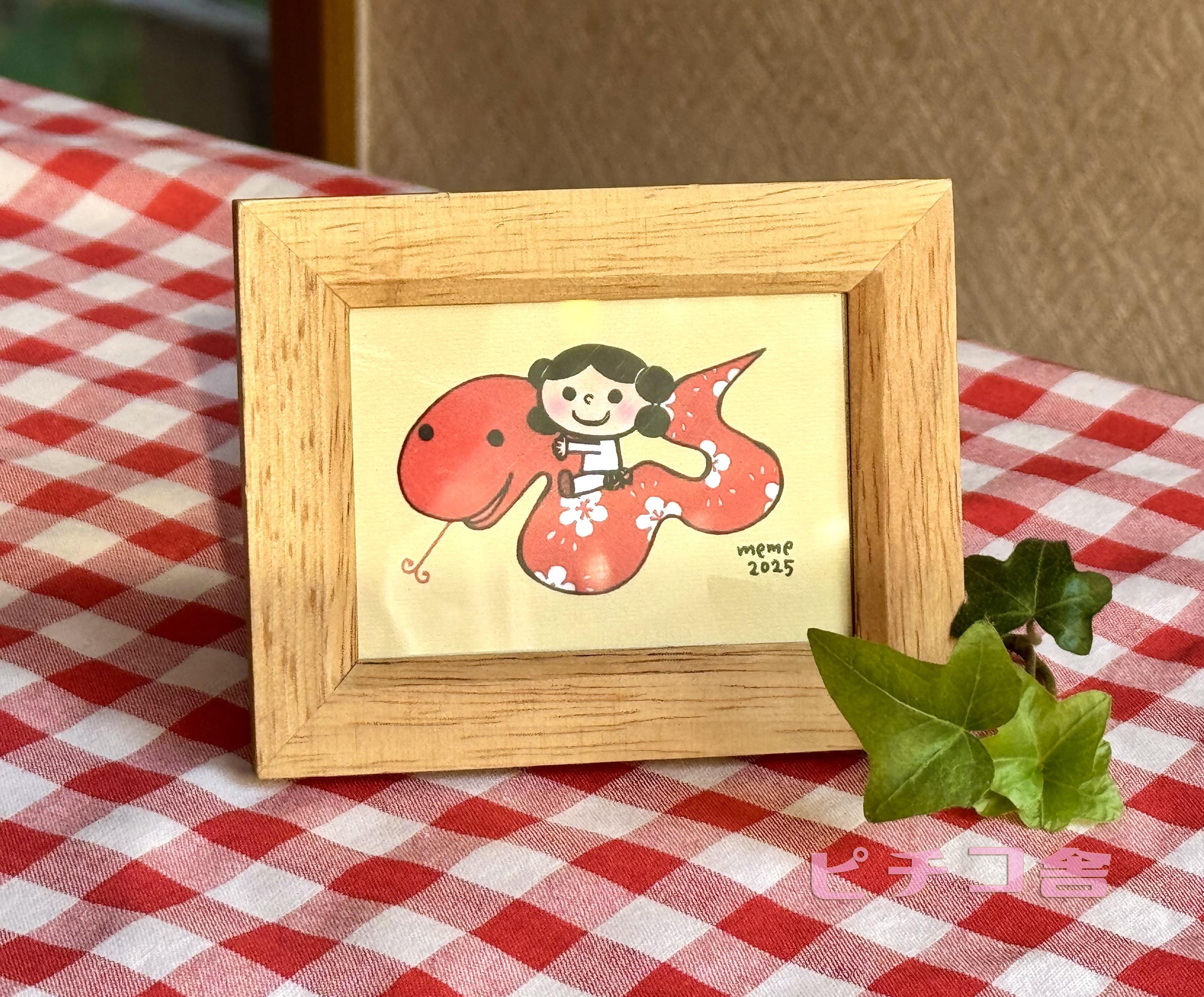 約9.8cm×7.8cm(額込み)の小さな作品です。机の上、またリビングの一角、玄関先にちょこんと飾っていただけると嬉しいです。