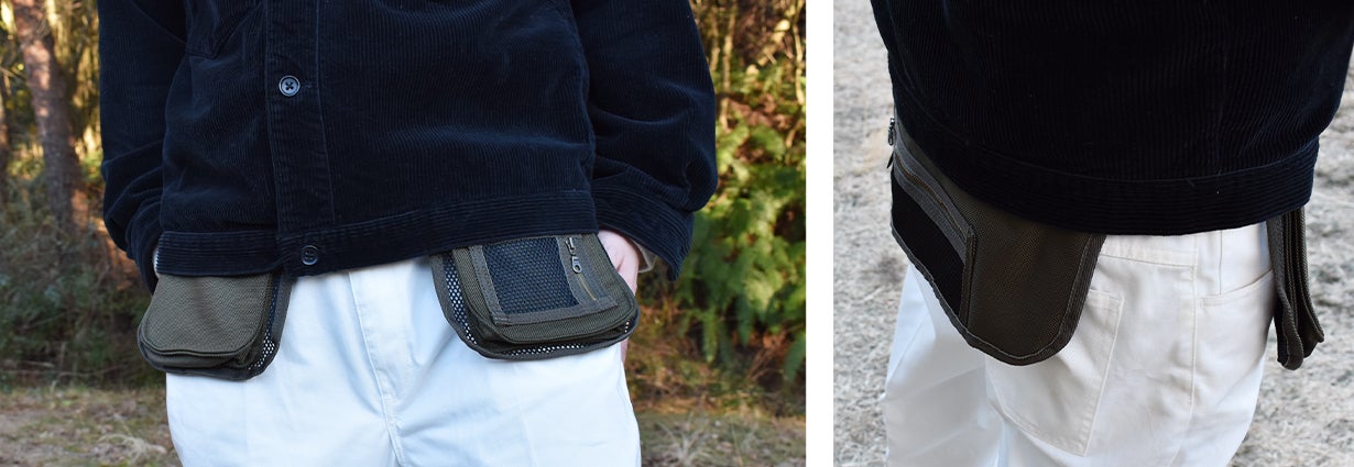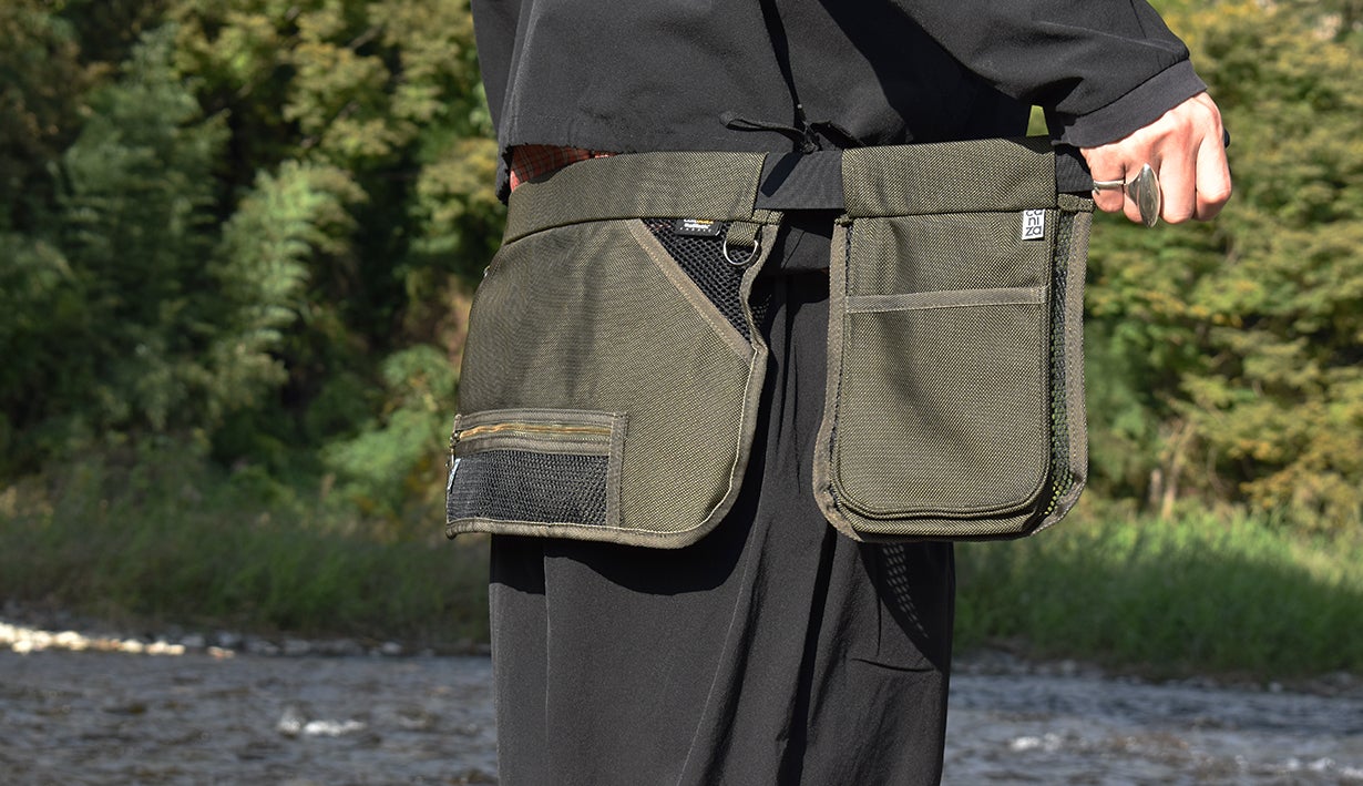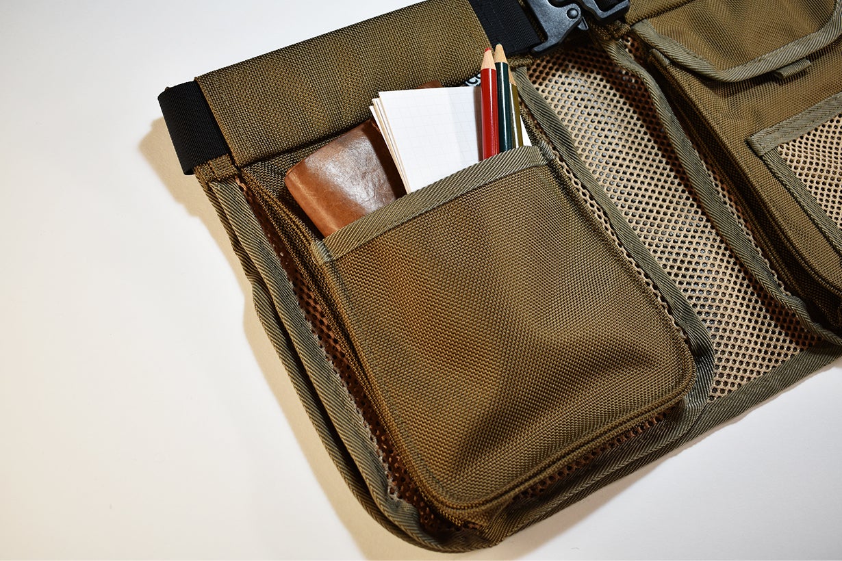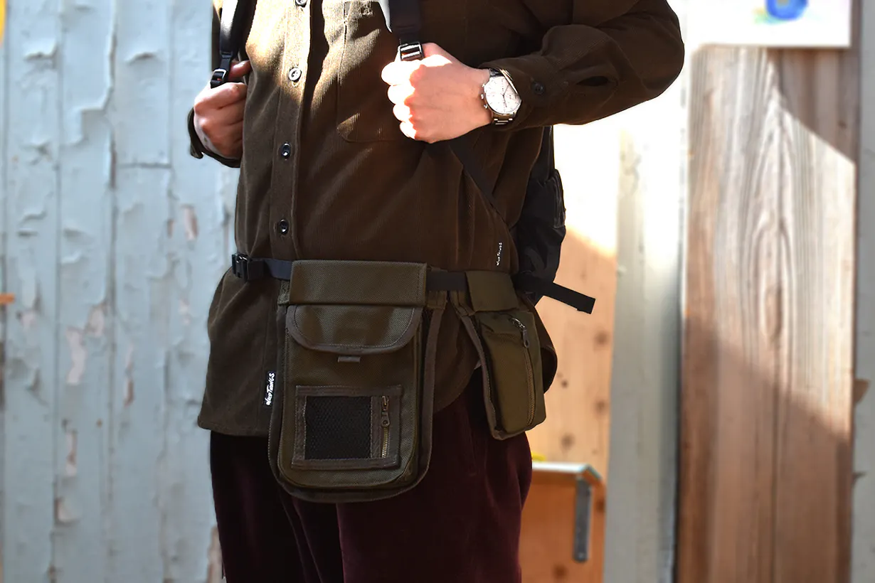 元は射撃用として使用されていたハンティングエプロンをリデザインし、日常的に使用するスマートフォンや財布などを収納するのに便利なウェアラブルマルチポケットに仕上げました。