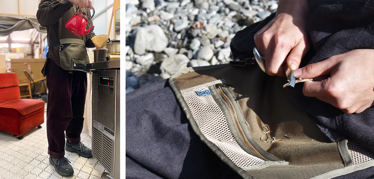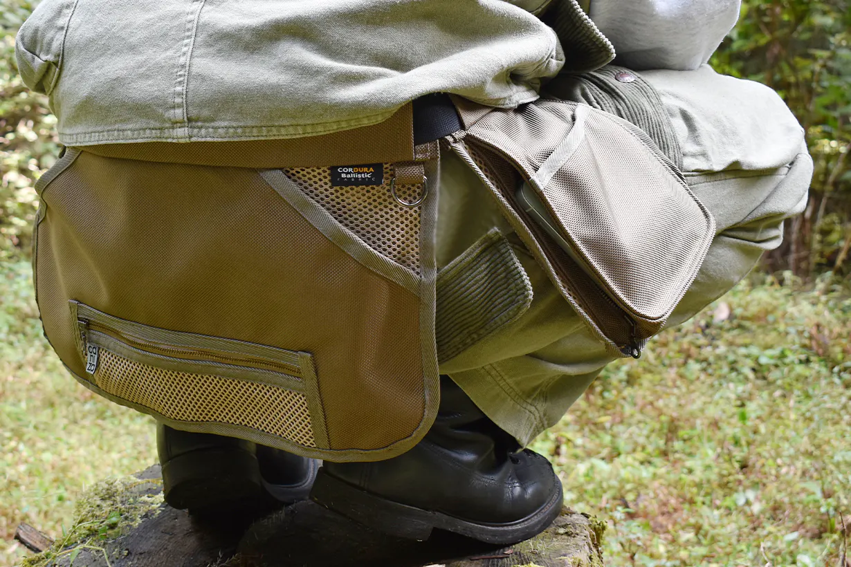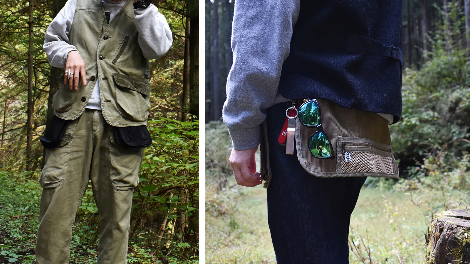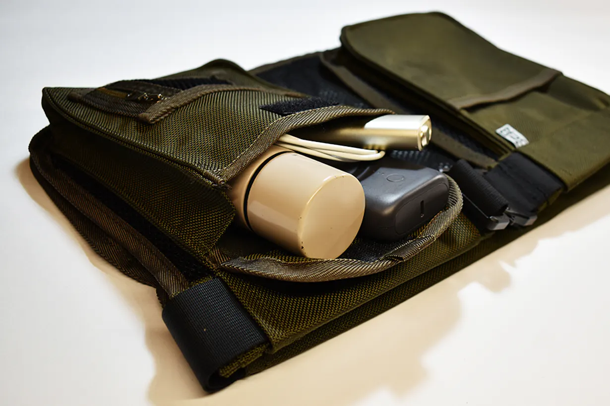 元は射撃用として使用されていたハンティングエプロンをリデザインし、日常的に使用するスマートフォンや財布などを収納するのに便利なウェアラブルマルチポケットに仕上げました。