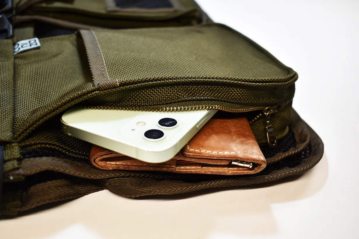 ファスナー付きのポケットで携帯電話なども安心して持ち運べます。