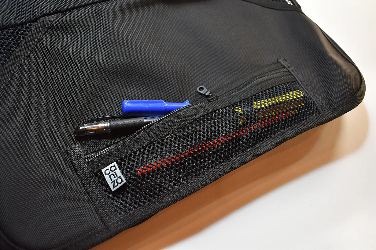 横長のメッシュポケットはペンや定規などの文房具をはじめ、サングラスなども収納できるサイズになっています。(踏まないように注意してください!)